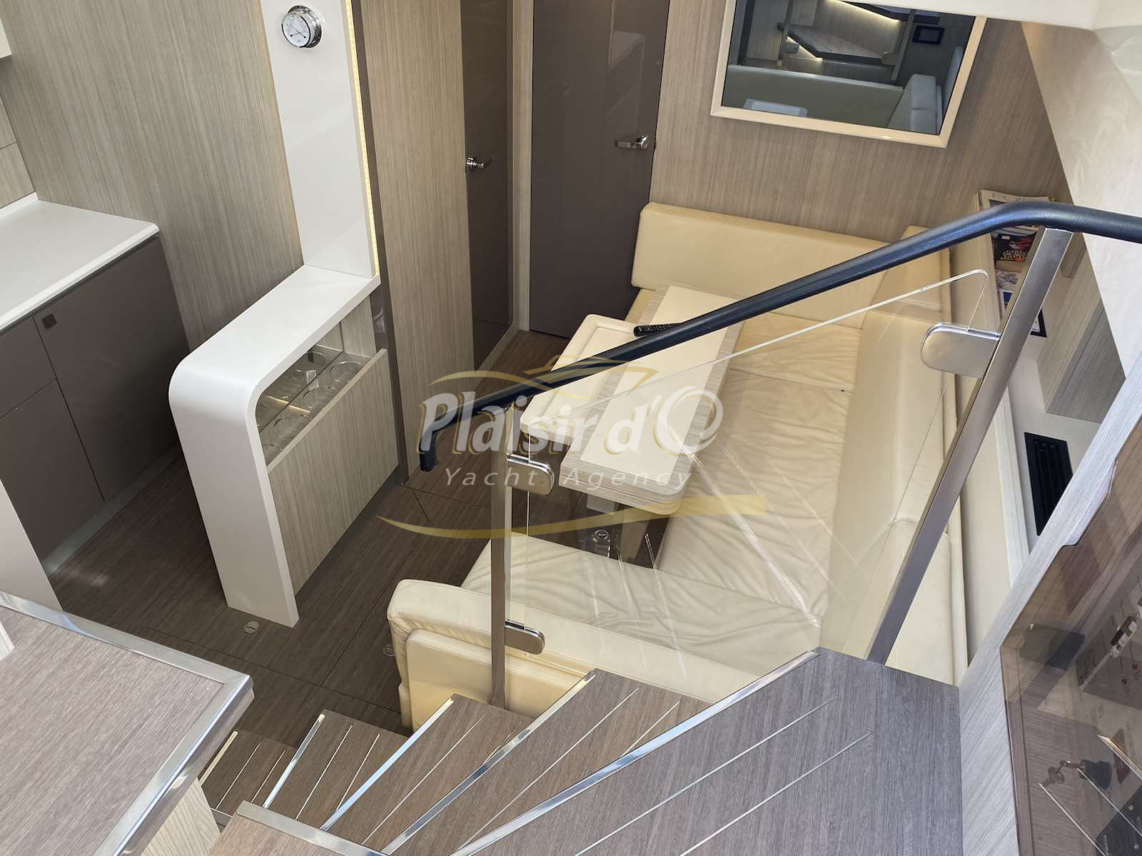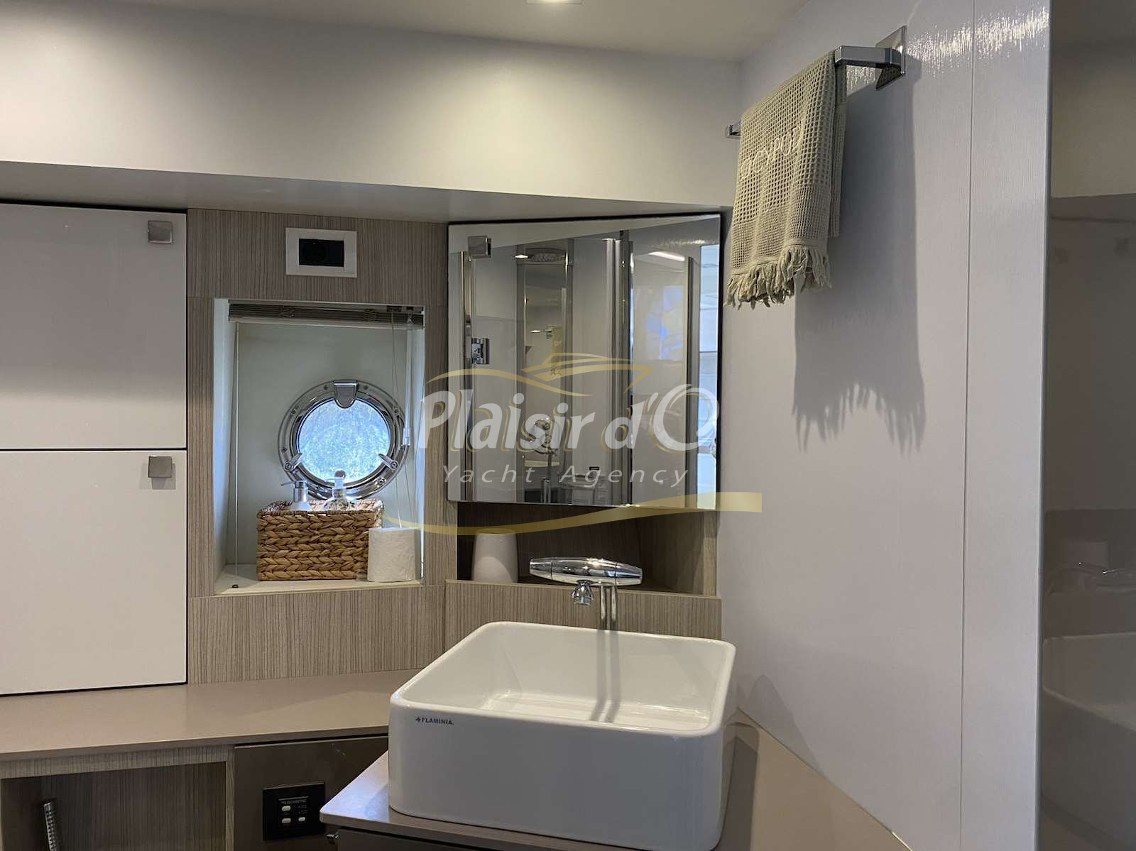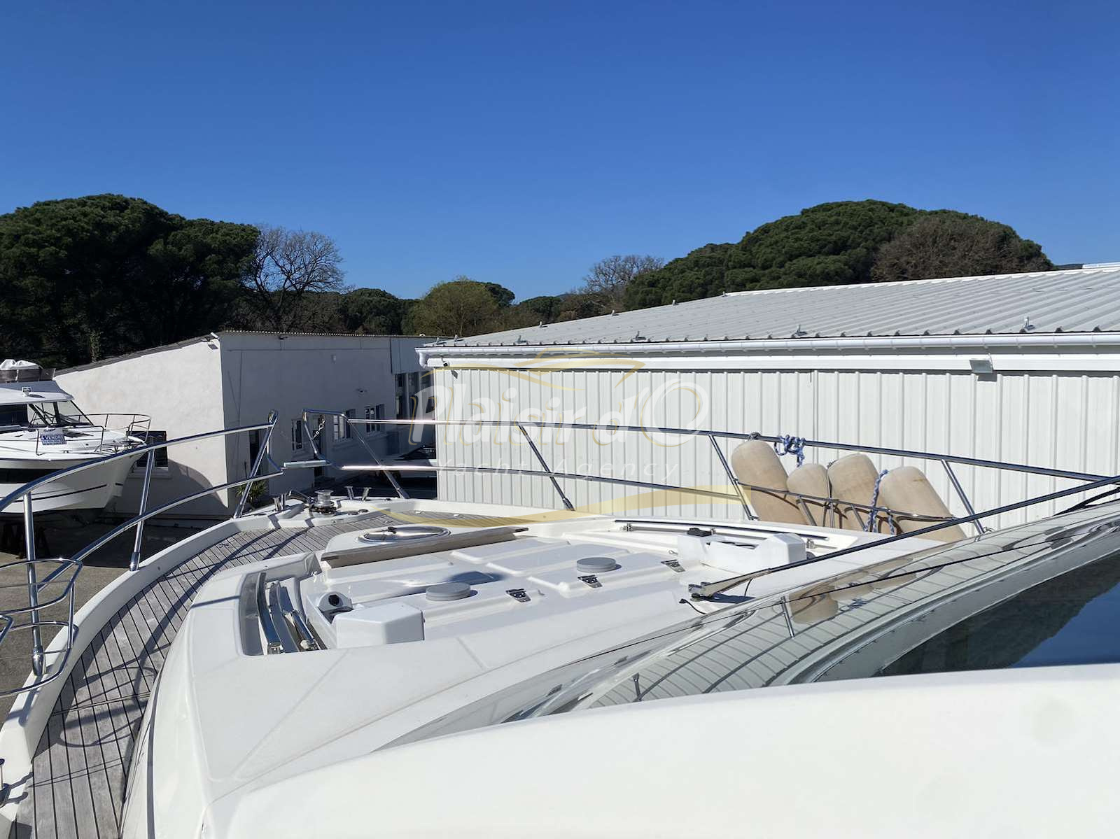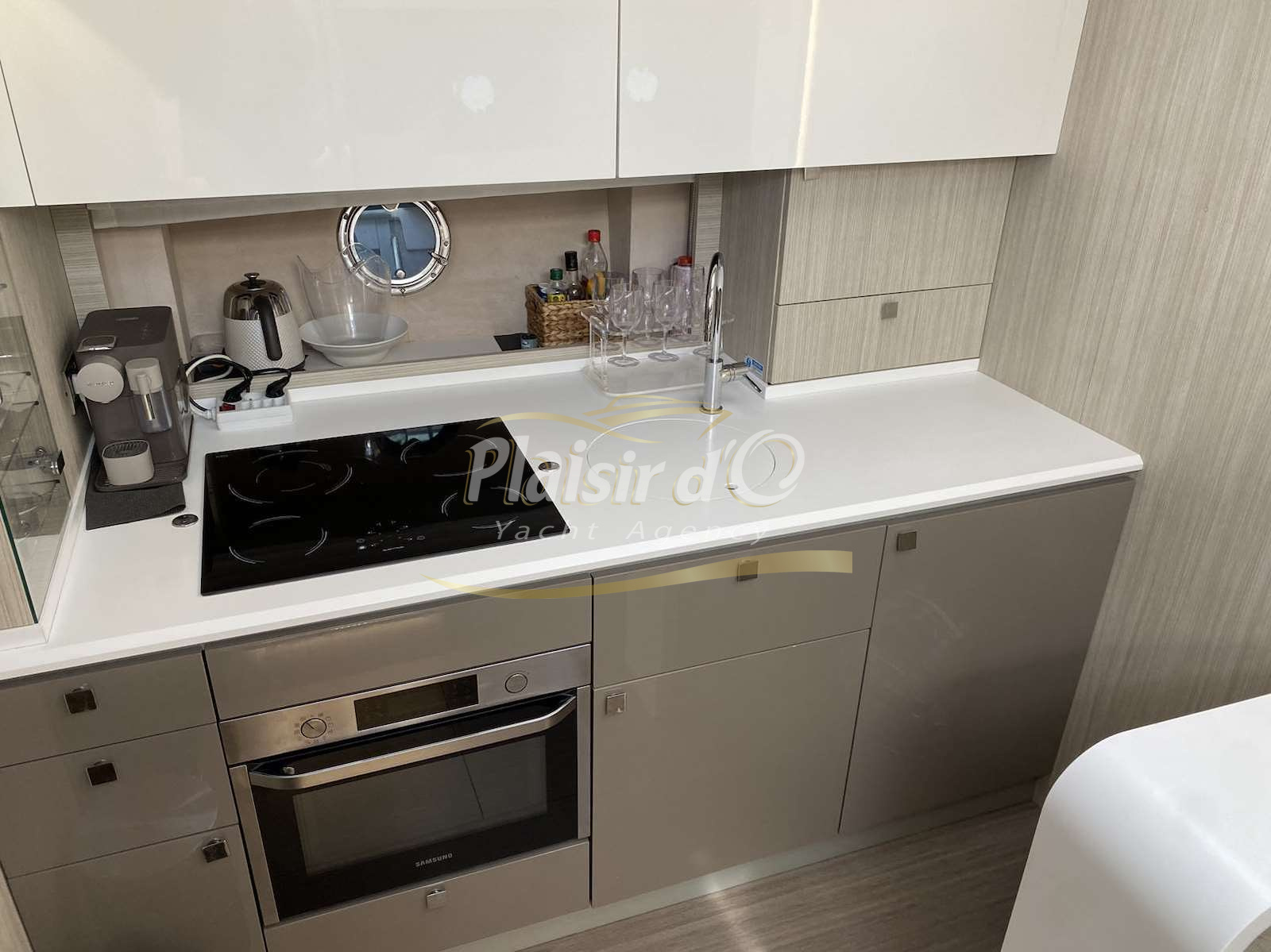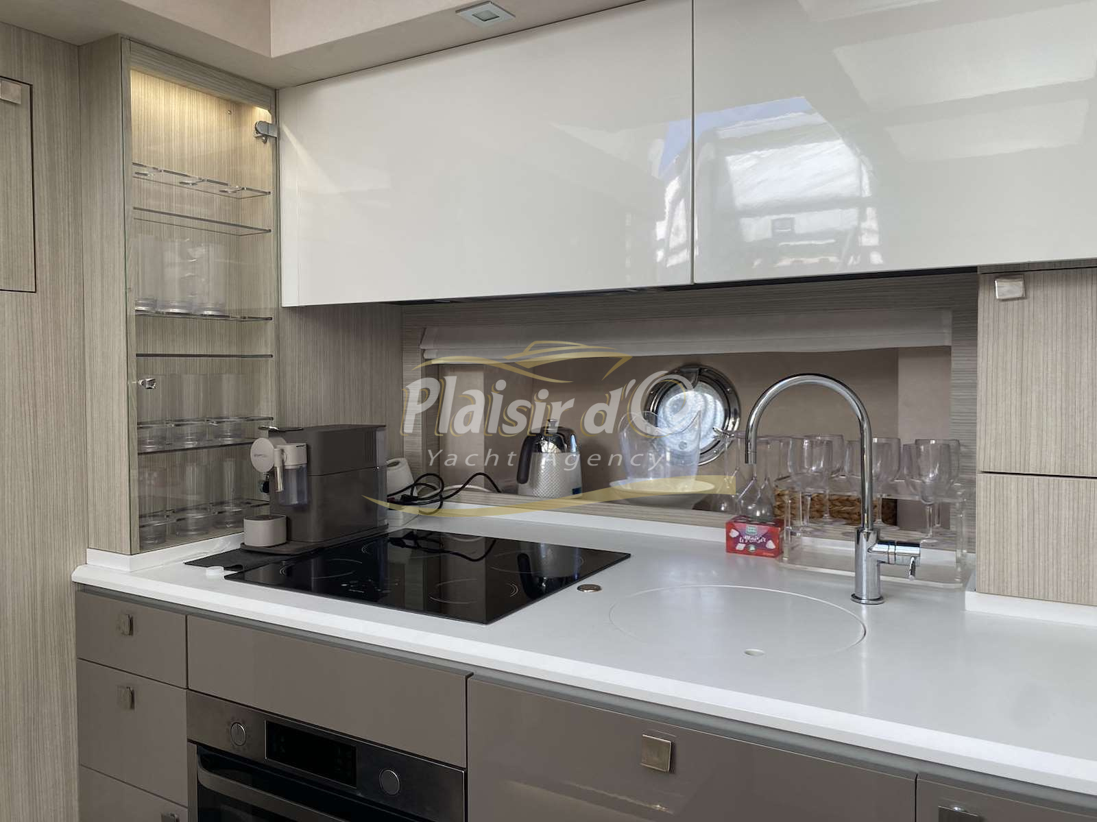 À l’extérieur, bains de soleil avant et arrière, cockpit convivial, passerelle hydraulique et plateforme de bain hydraulique en teck complètent ce yacht parfaitement équipé, idéal pour des croisières haut de gamme en famille ou entre amis.
