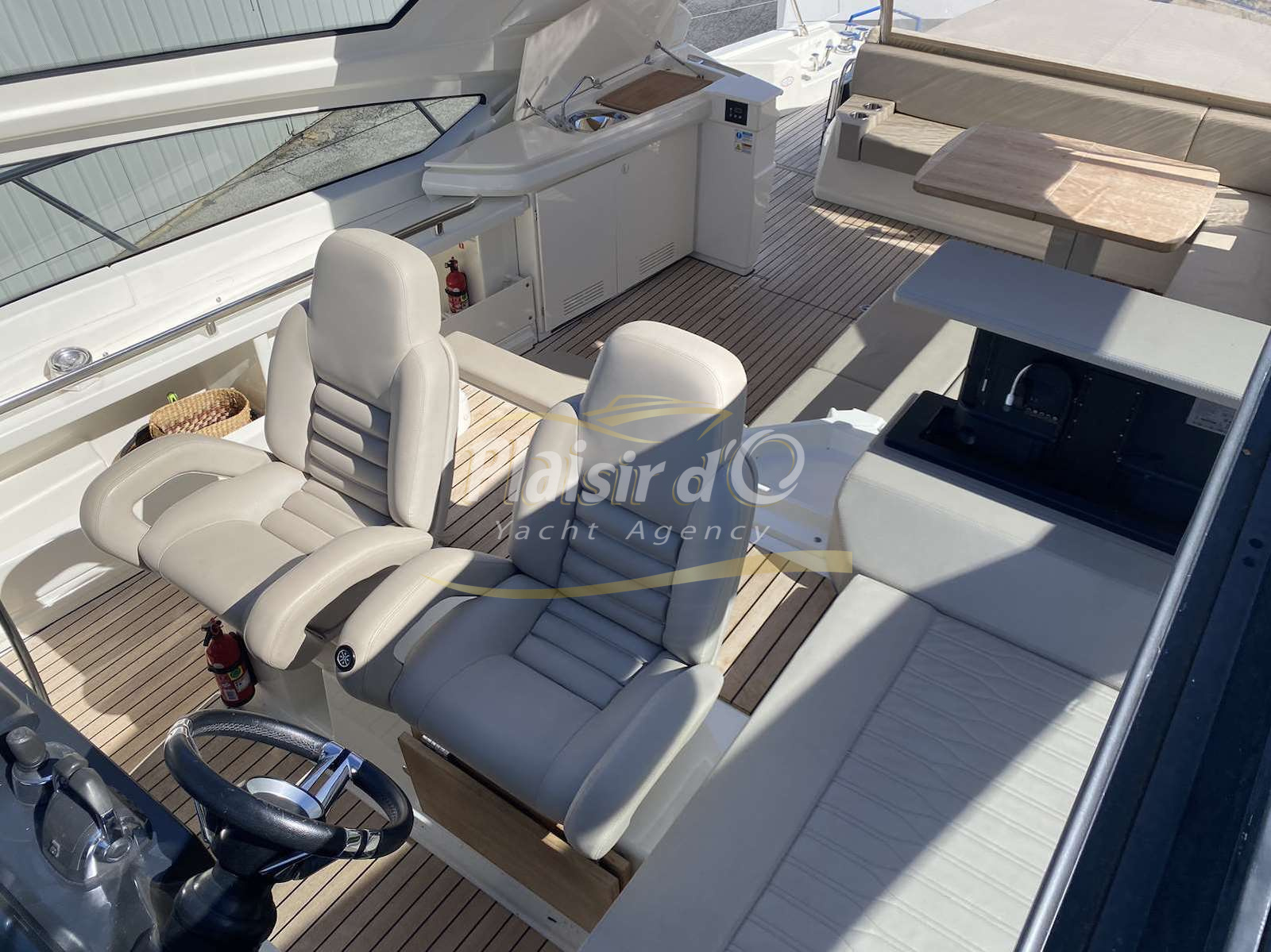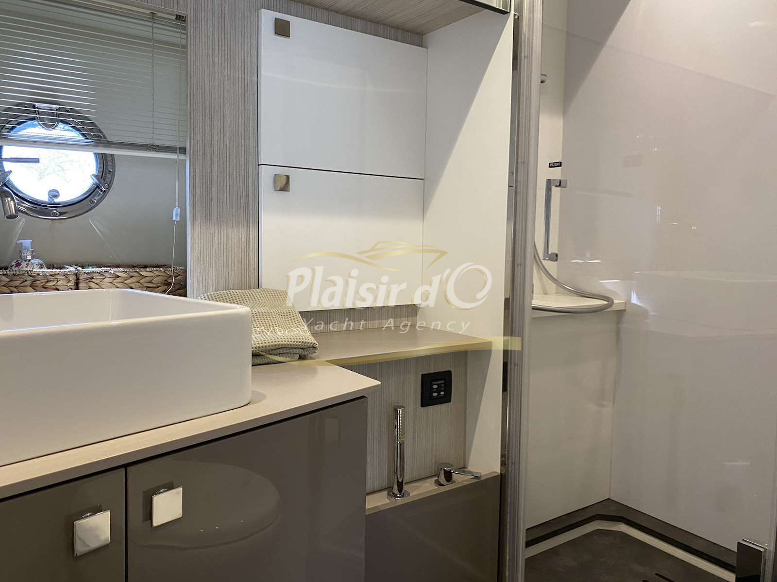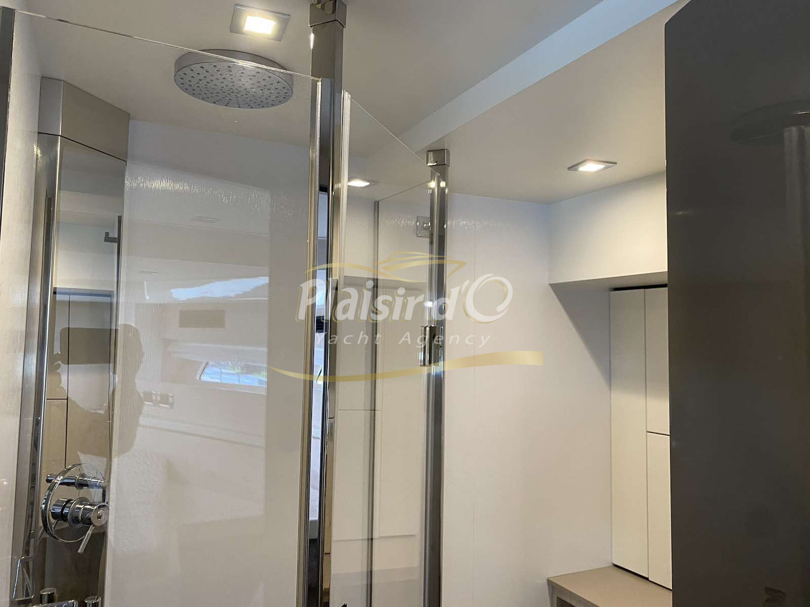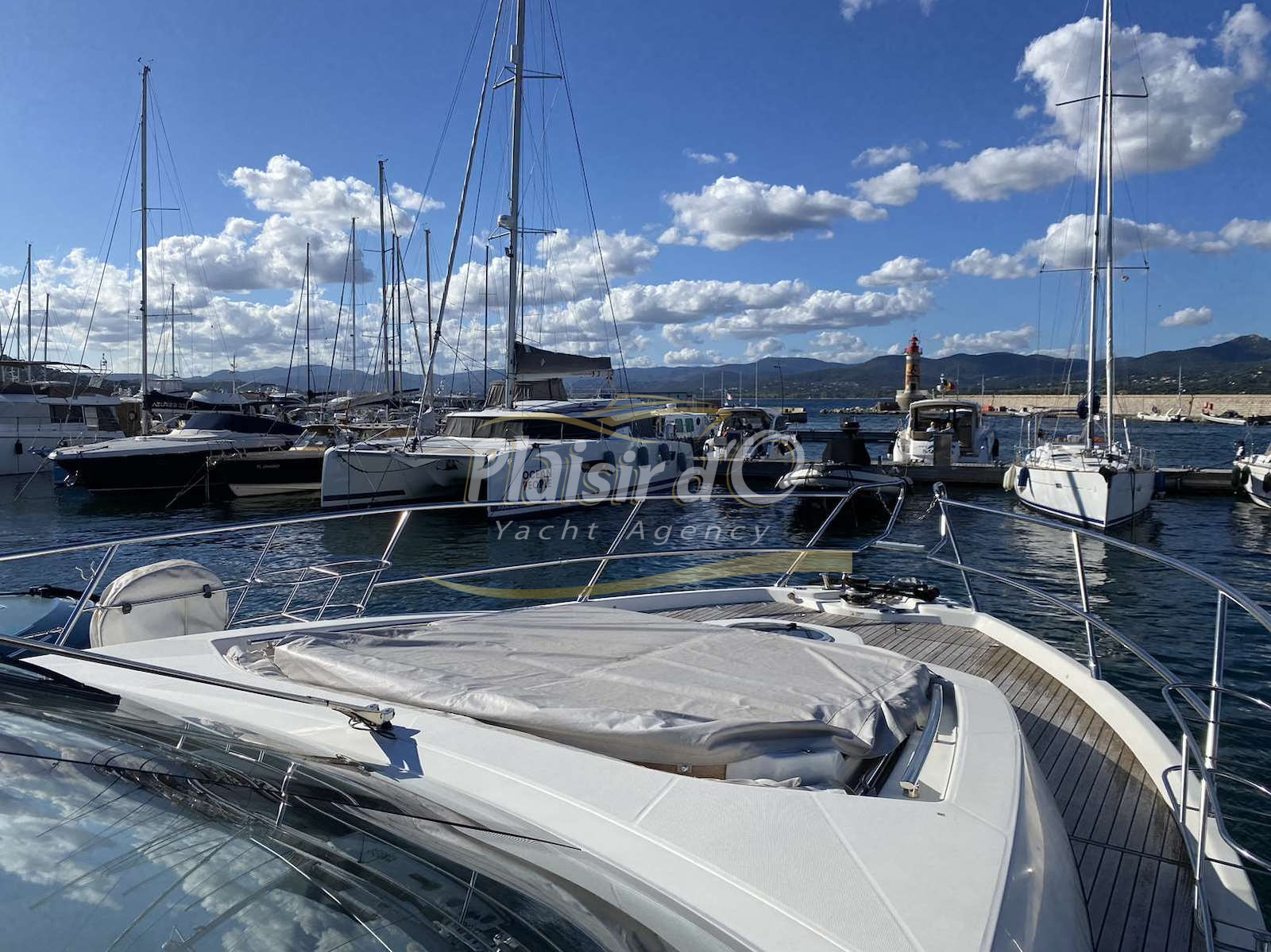 À l’extérieur, bains de soleil avant et arrière, cockpit convivial, passerelle hydraulique et plateforme de bain hydraulique en teck complètent ce yacht parfaitement équipé, idéal pour des croisières haut de gamme en famille ou entre amis.