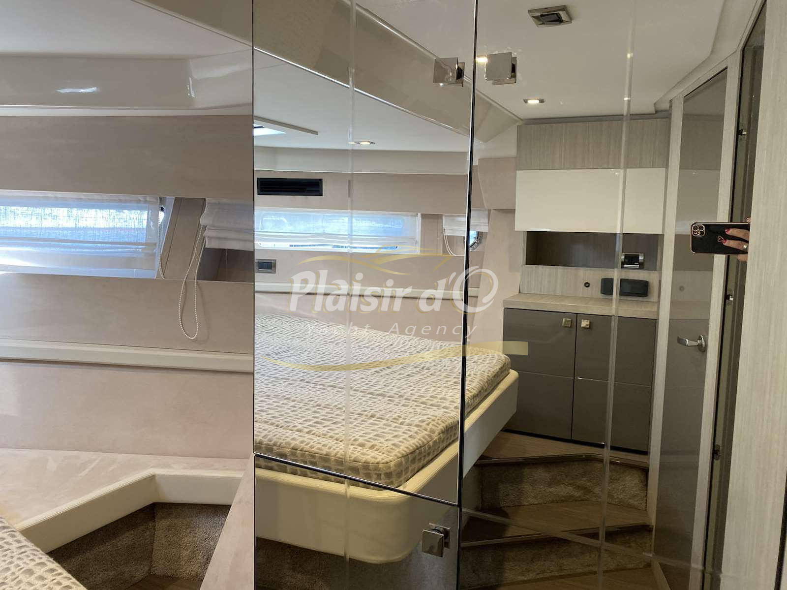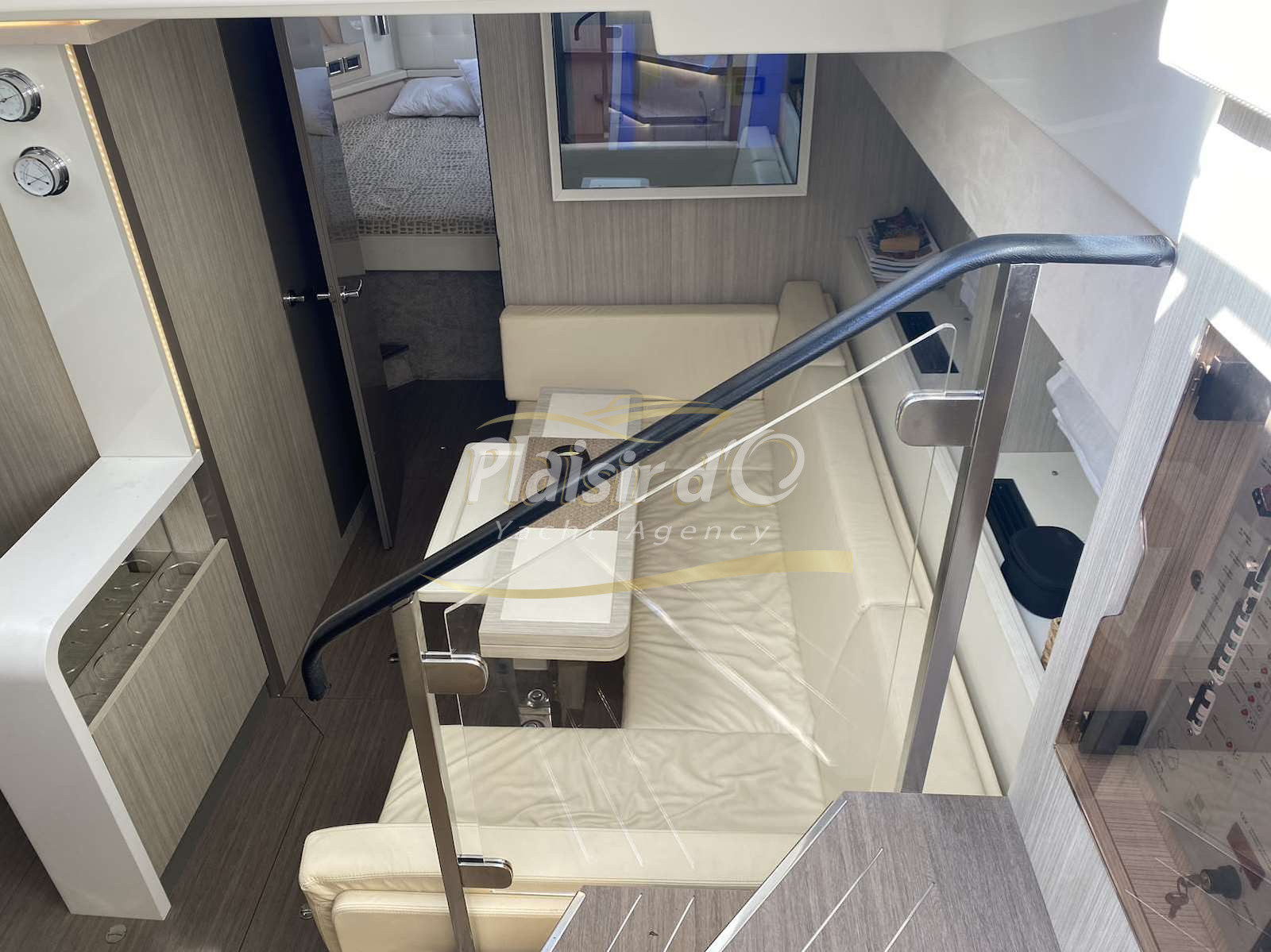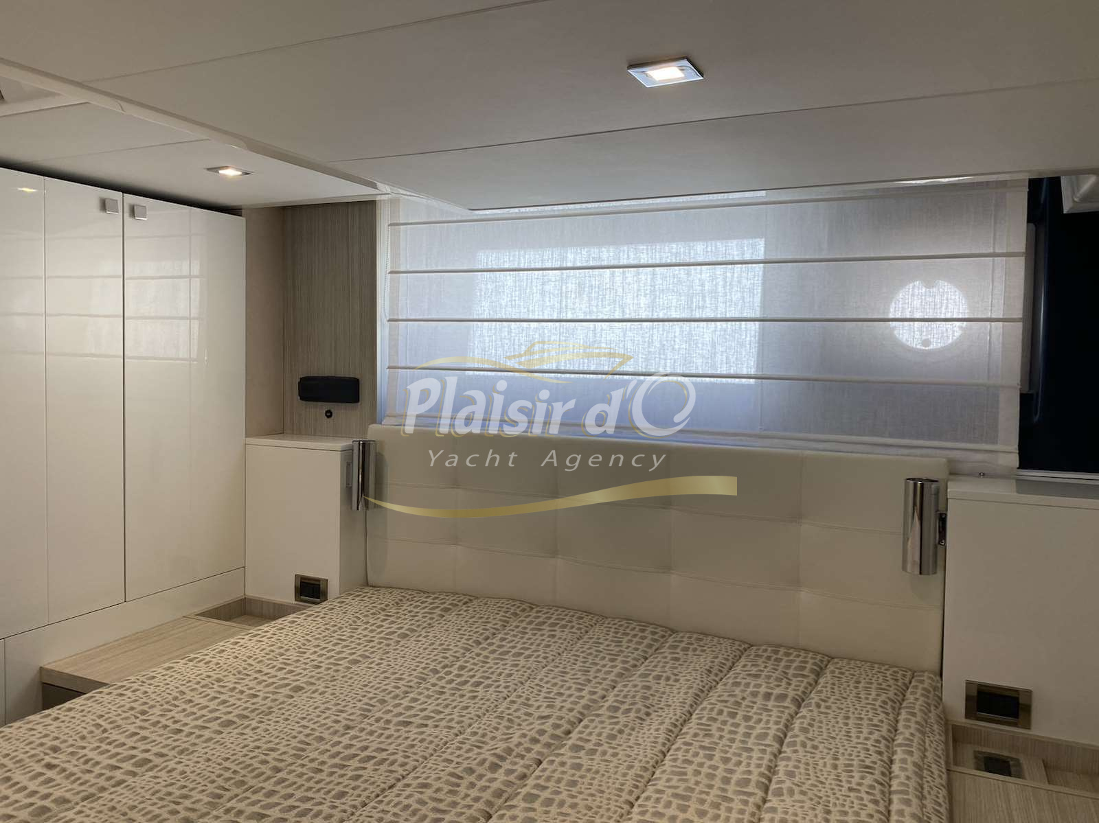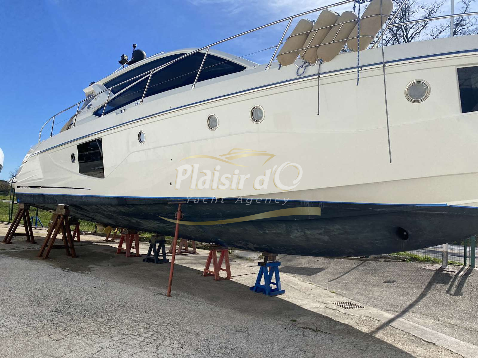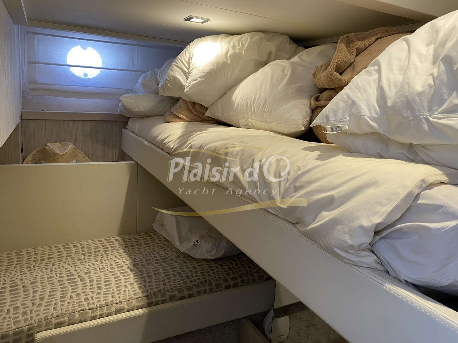 À l’extérieur, bains de soleil avant et arrière, cockpit convivial, passerelle hydraulique et plateforme de bain hydraulique en teck complètent ce yacht parfaitement équipé, idéal pour des croisières haut de gamme en famille ou entre amis.