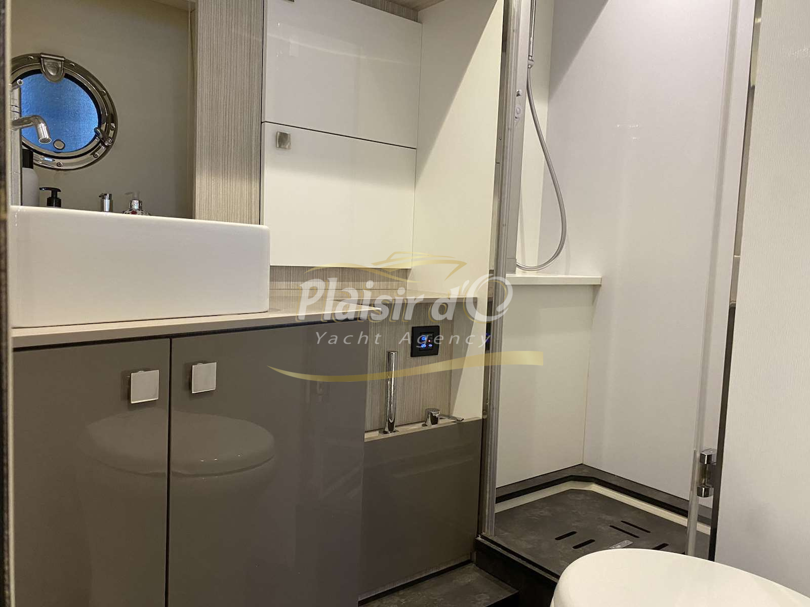 En version 3 cabines + 1 cabine équipage, 2 salles de bains avec WC électriques et un carré convertible. Les menuiseries intérieures sont en excellent état. Côté confort : climatisation, chauffage, réservoir d’eau douce 540 L, cuisine entièrement équipée (réfrigérateur, congélateur, icemaker, four, micro-ondes, plaque), lave-linge et prise d’eau directe.