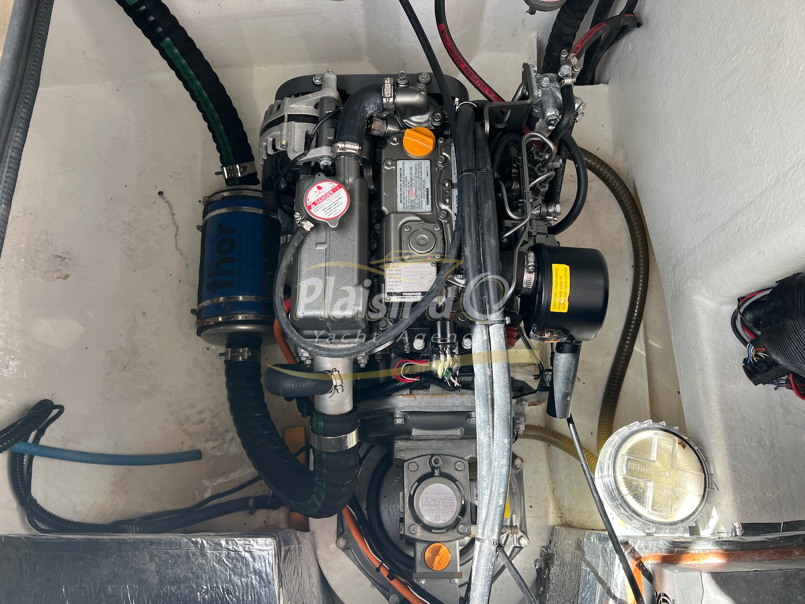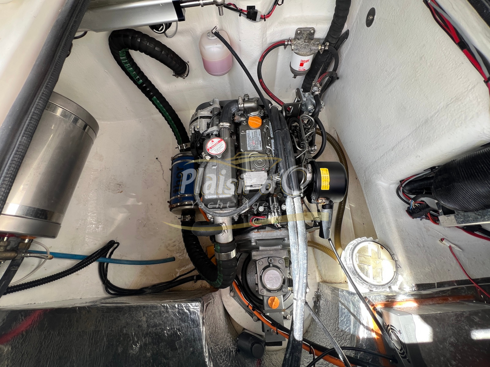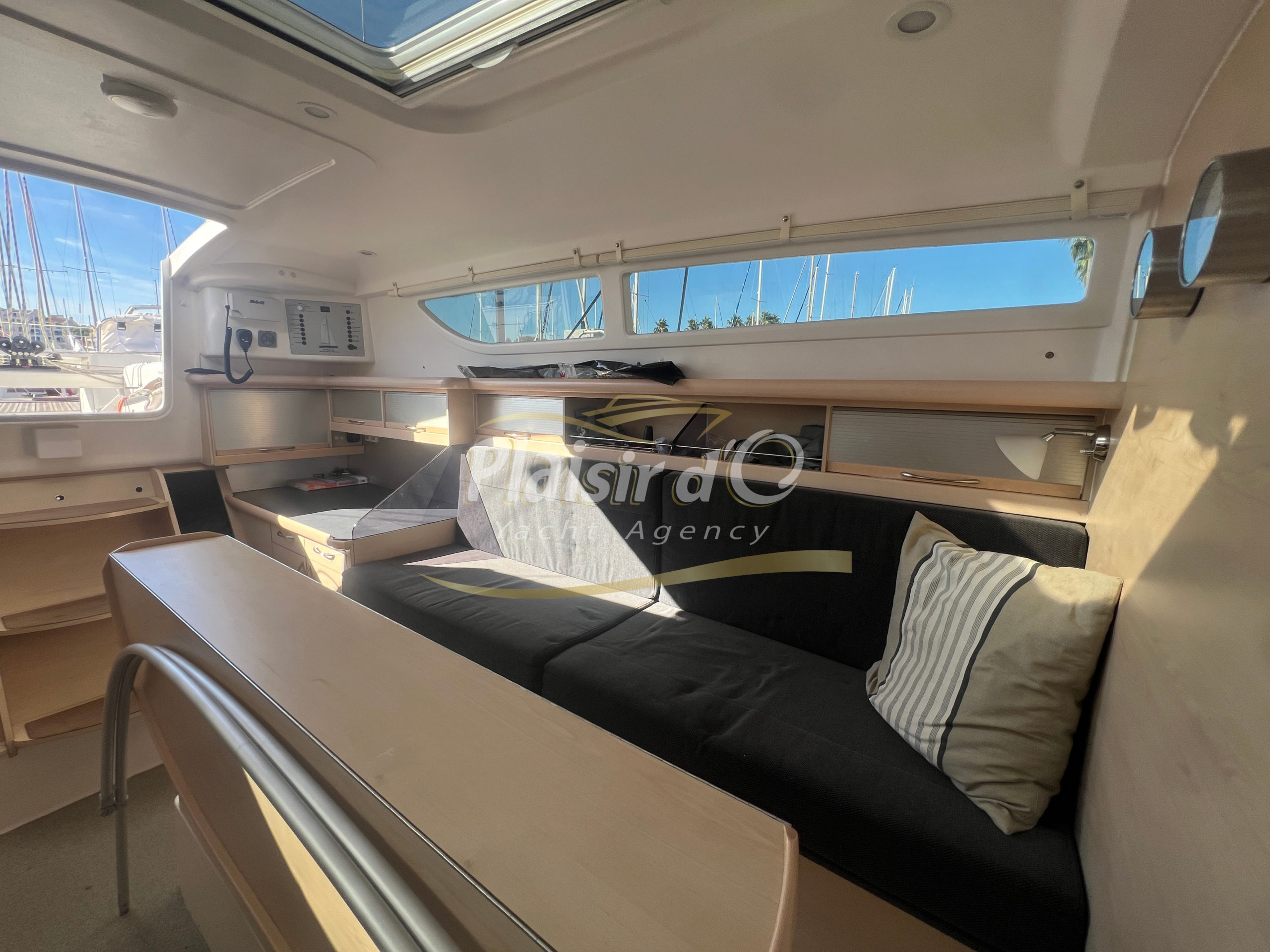 Grâce à sa motorisation Yanmar de 21cv (450h seulement) et son propulseur d’étrave rétractable, les manœuvres sont aisées, même en solo.