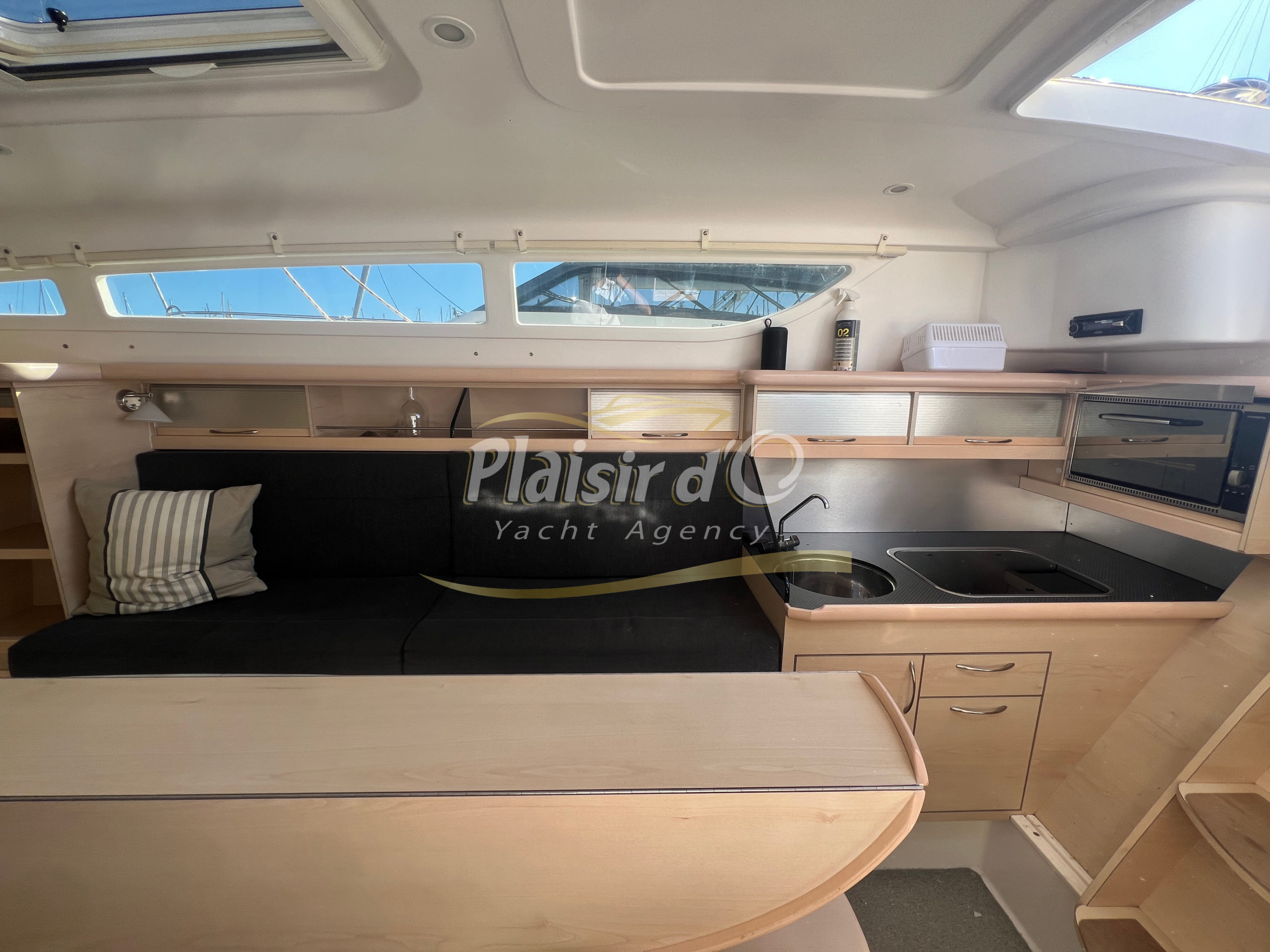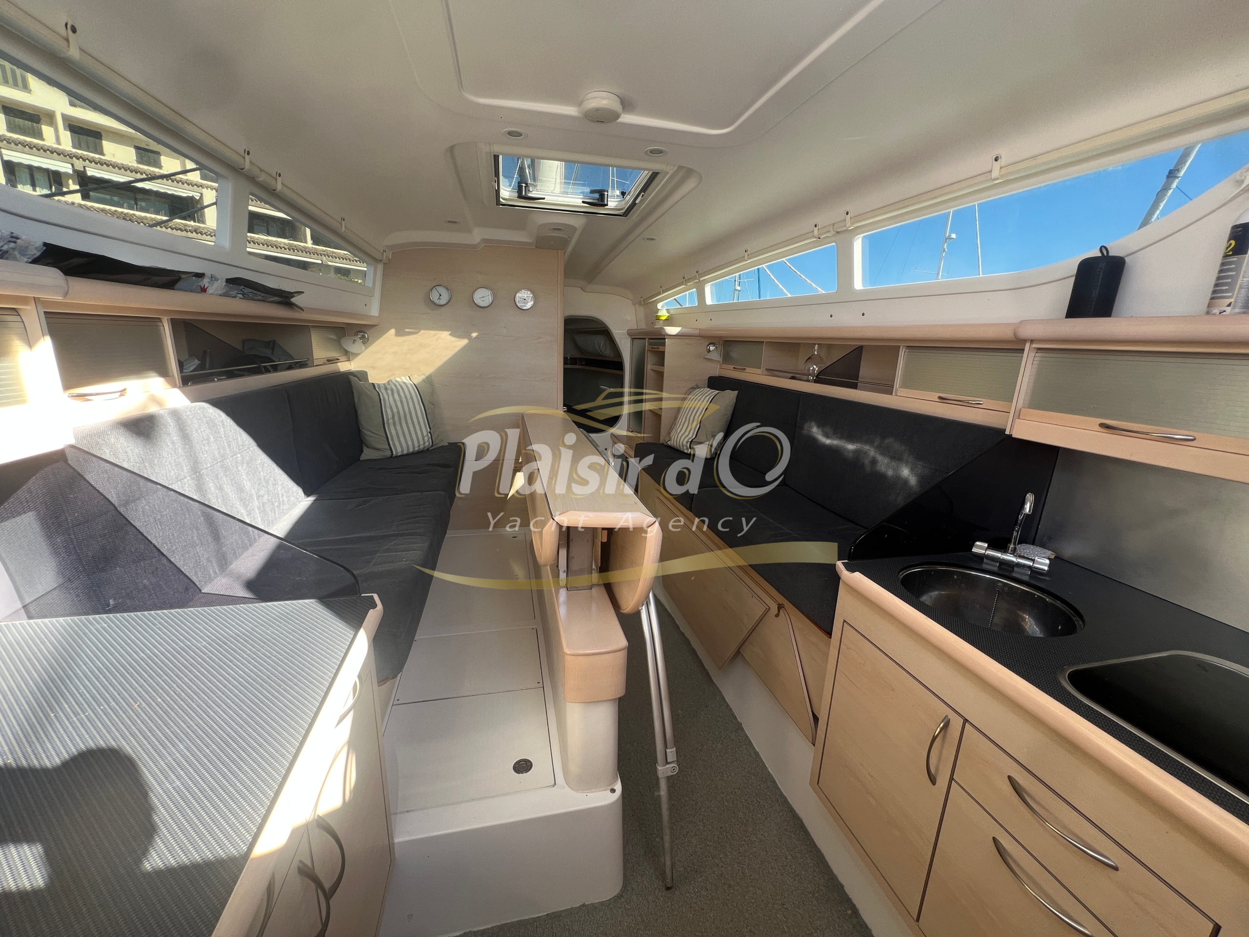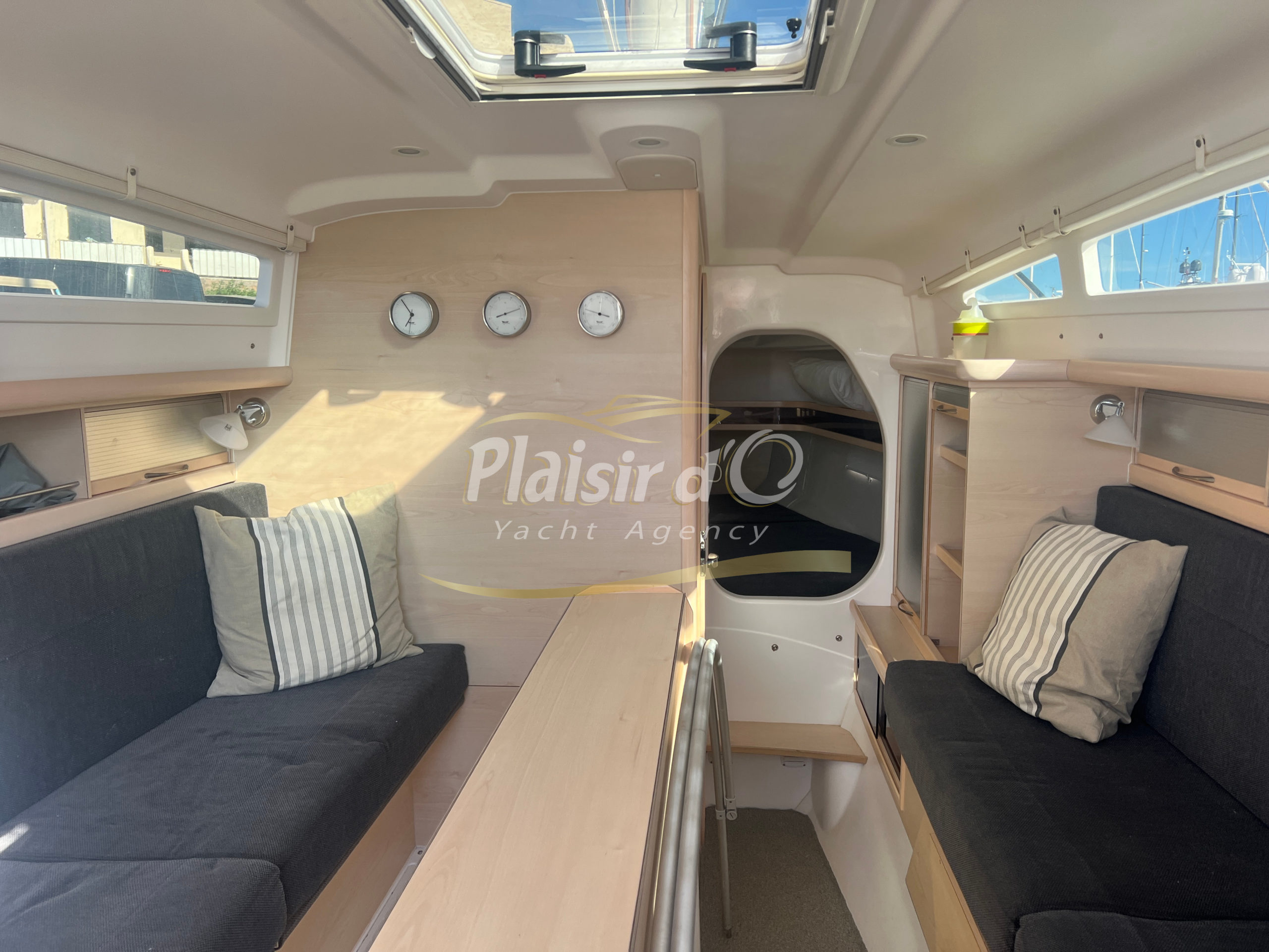 À l’intérieur, le confort est au rendez-vous avec deux cabines, un carré convertible, une cuisine tout équipée (réchaud, four, frigo, chauffe-eau), un chauffage Eberspächer.
