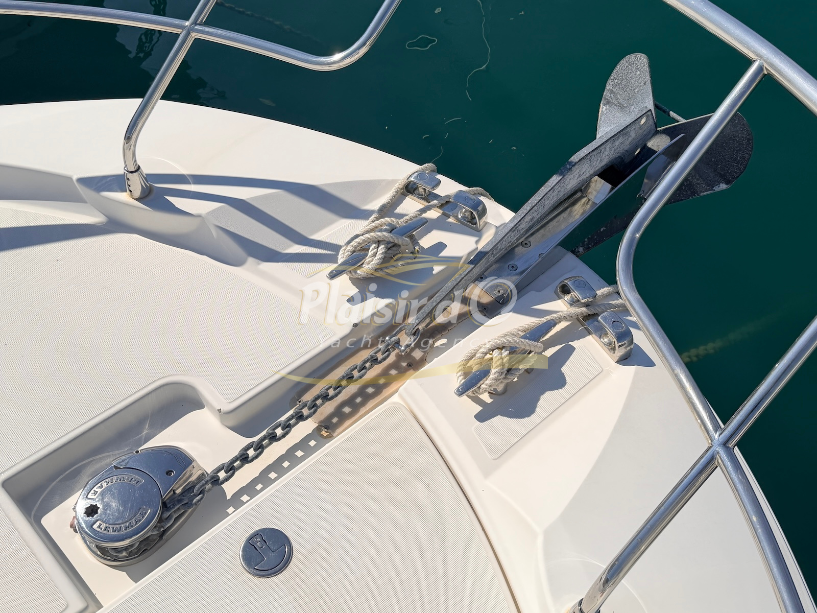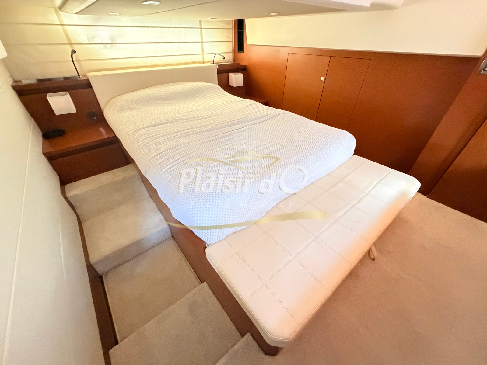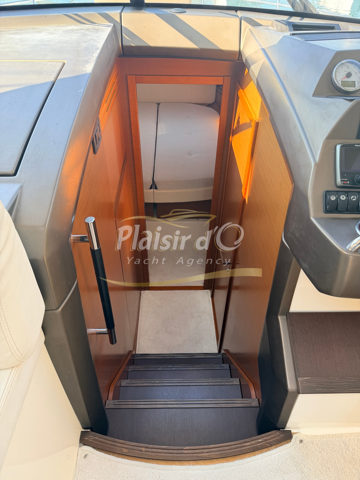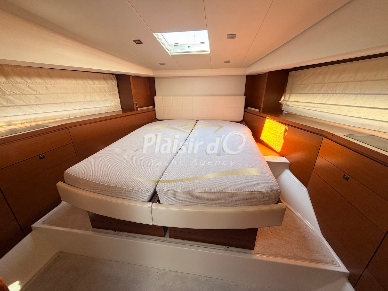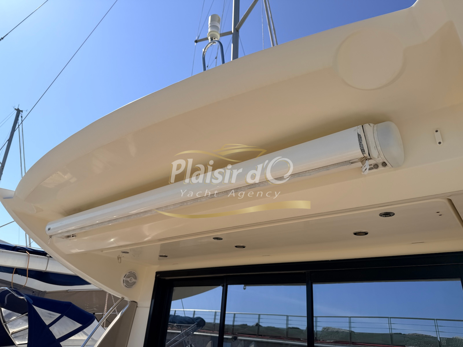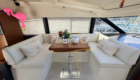 OPTIONS : Passerelle hydraulique, générateur MASE, climatisation réversible, Hard-top électrique, pilote automatique, cockpit et plateforme de bain en teck, lave vaisselle, store électrique, taud de pare brise micro perforé, compteur de chaine, propulseur d’étrave…