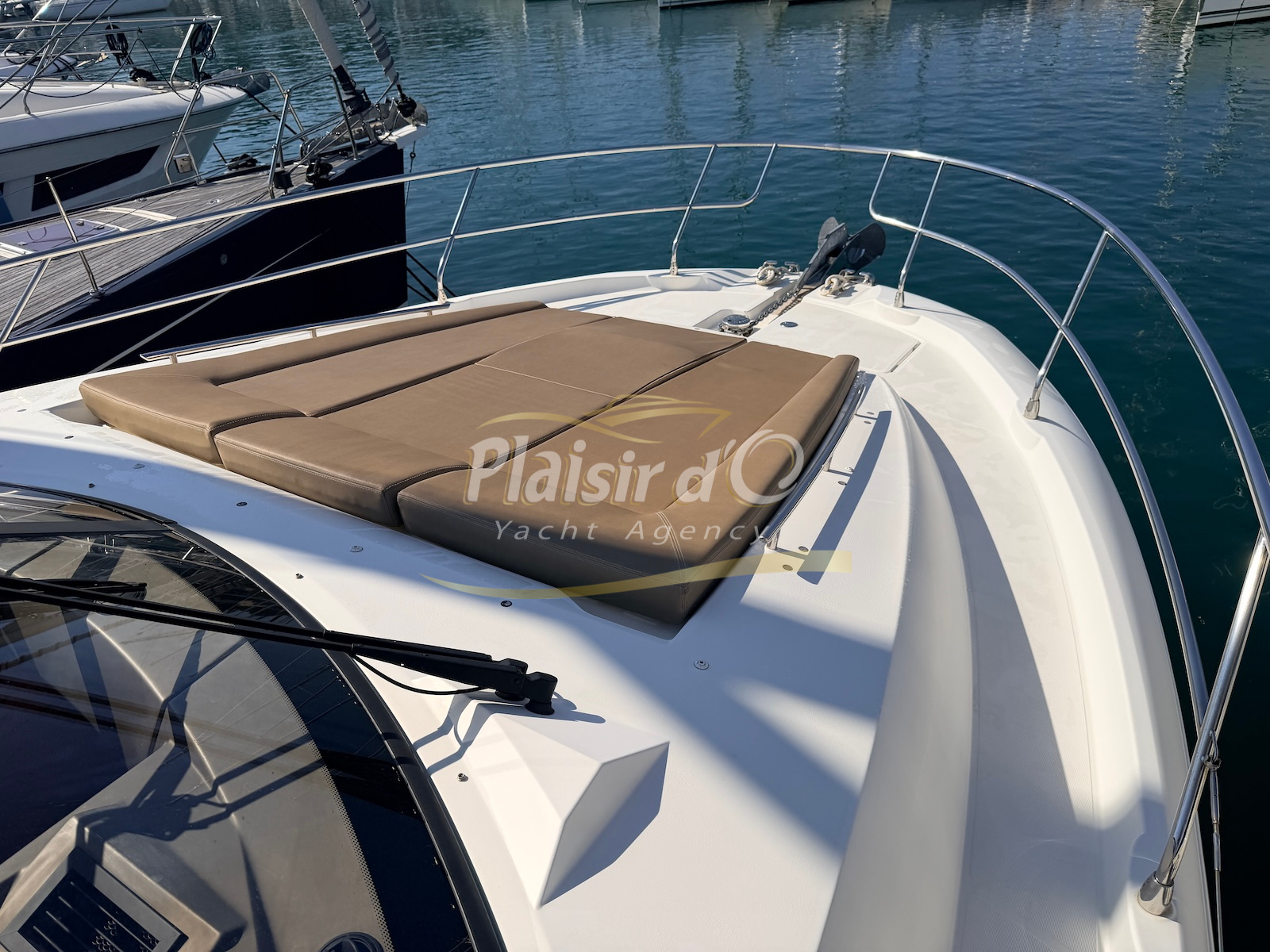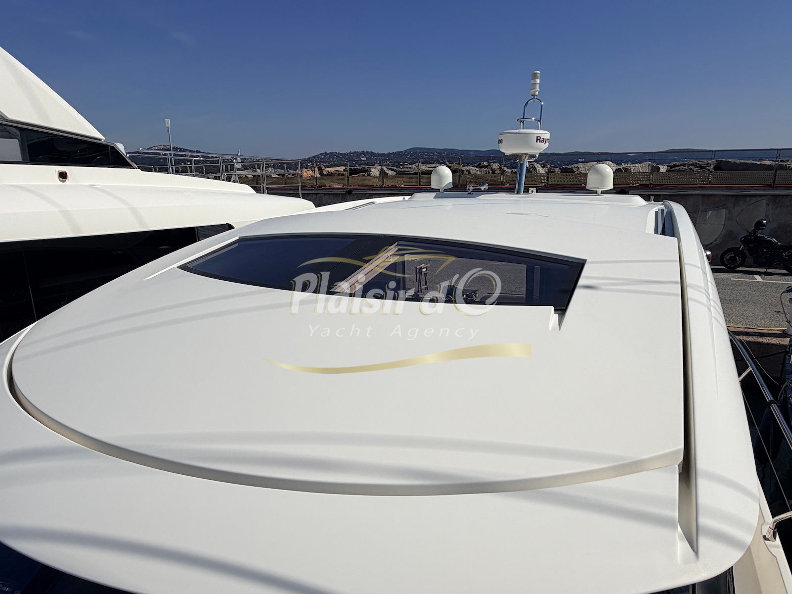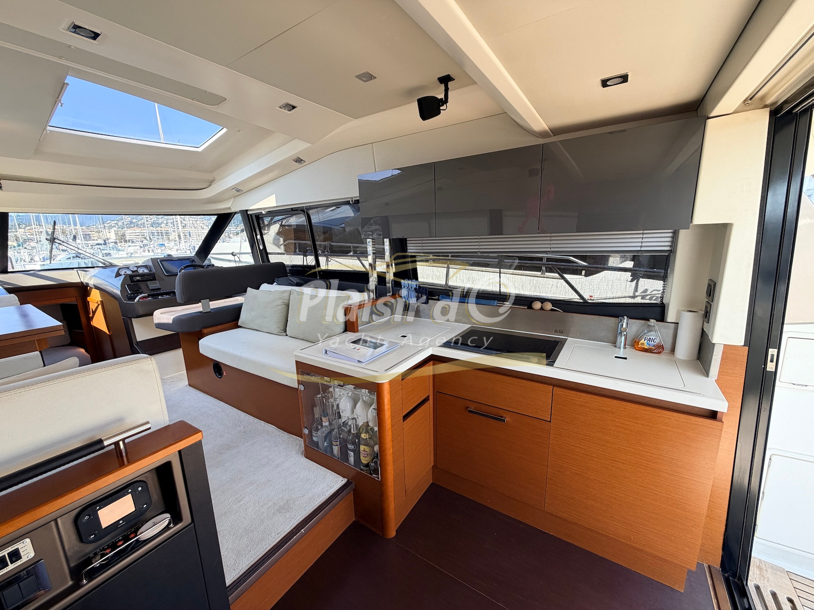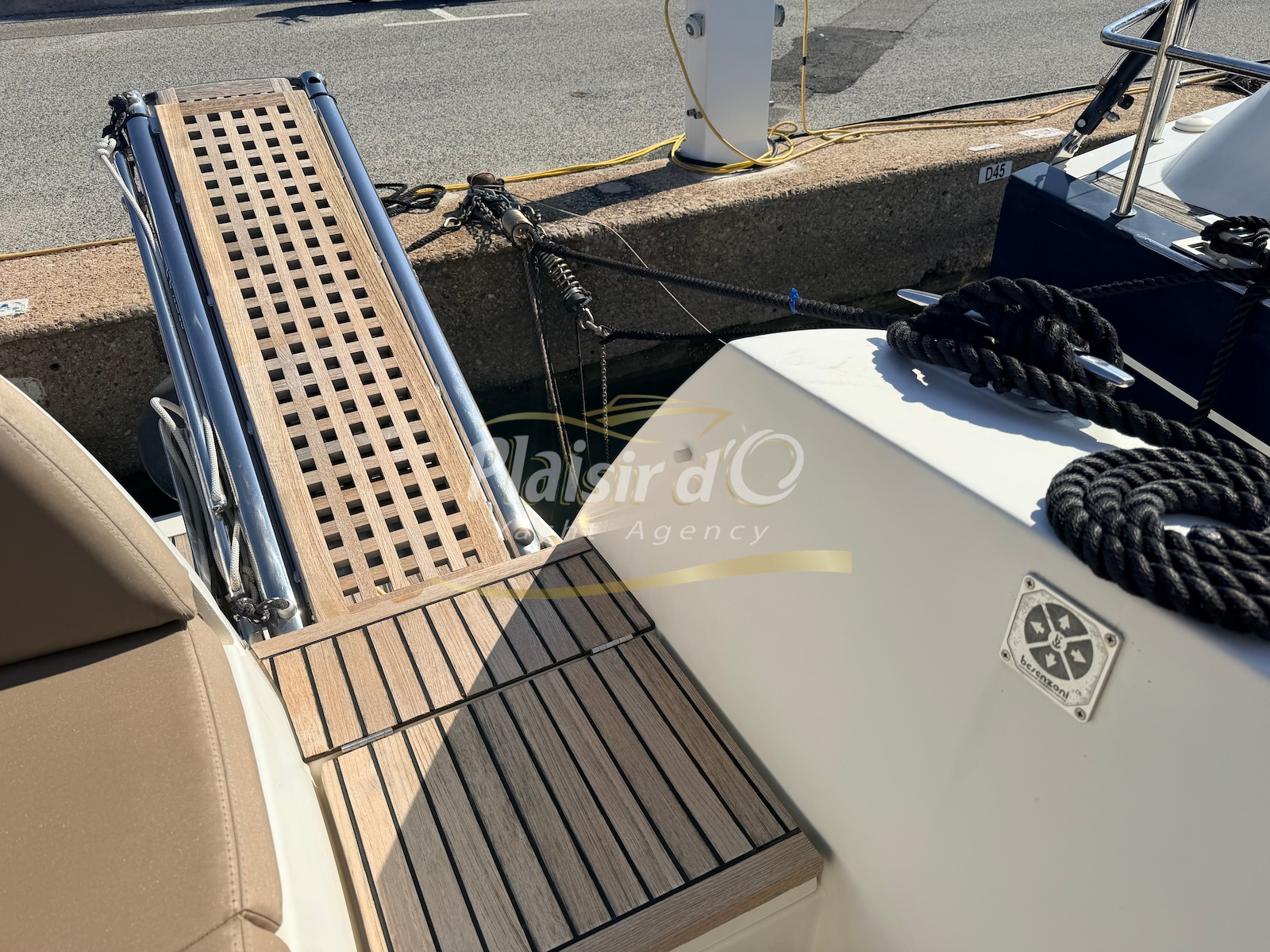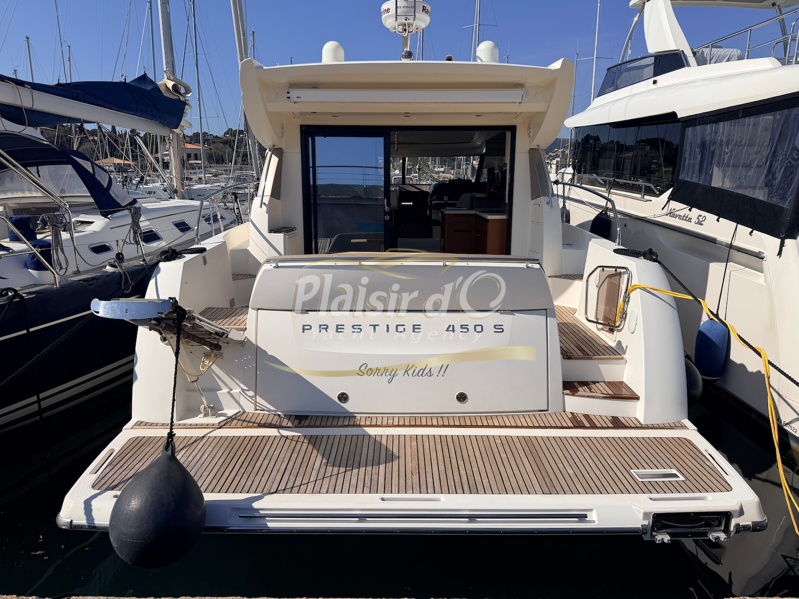OPTIONS : Passerelle hydraulique, générateur MASE, climatisation réversible, Hard-top électrique, pilote automatique, cockpit et plateforme de bain en teck, lave vaisselle, store électrique, taud de pare brise micro perforé, compteur de chaine, propulseur d’étrave…