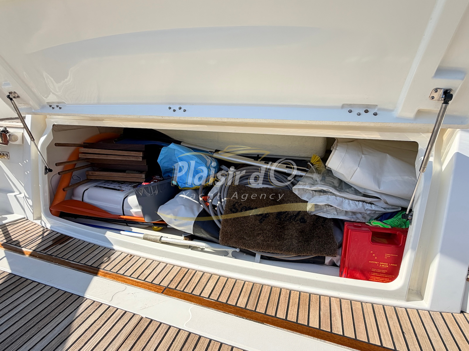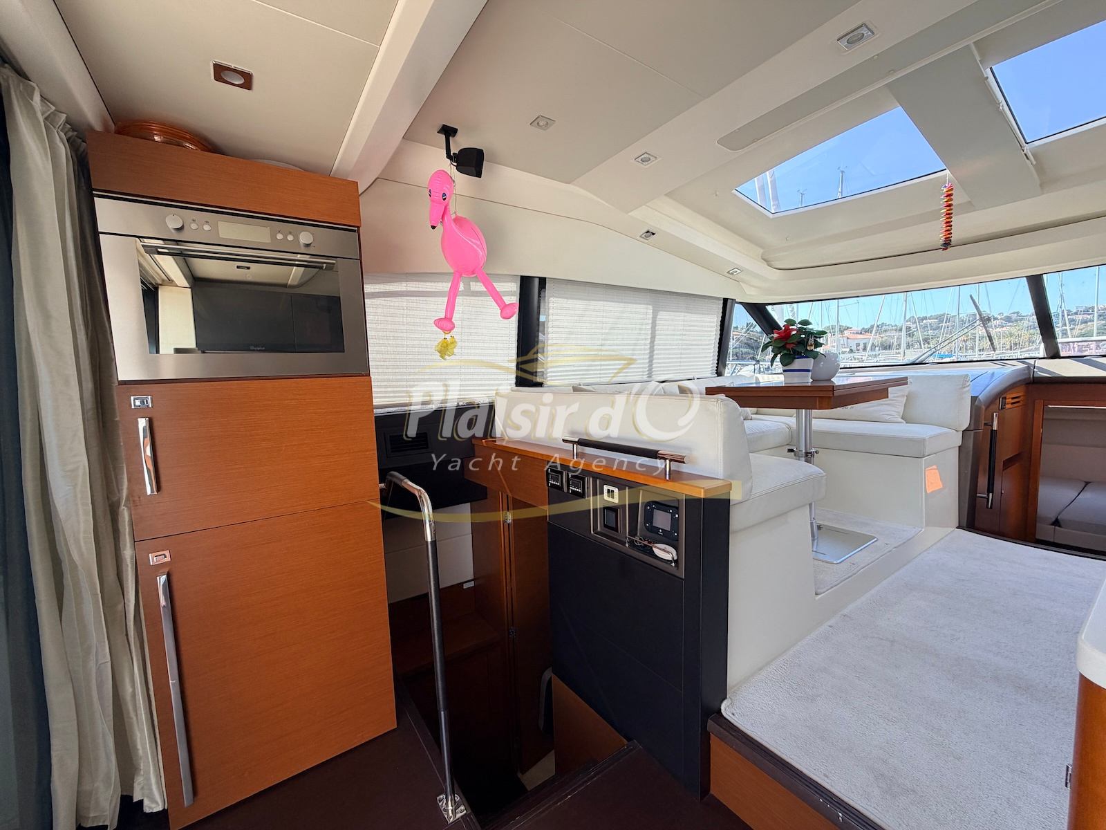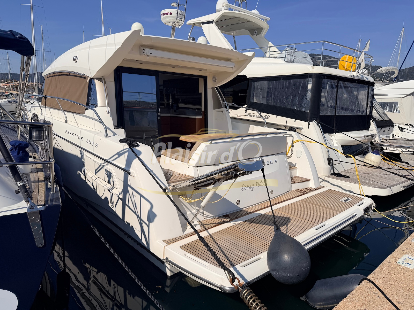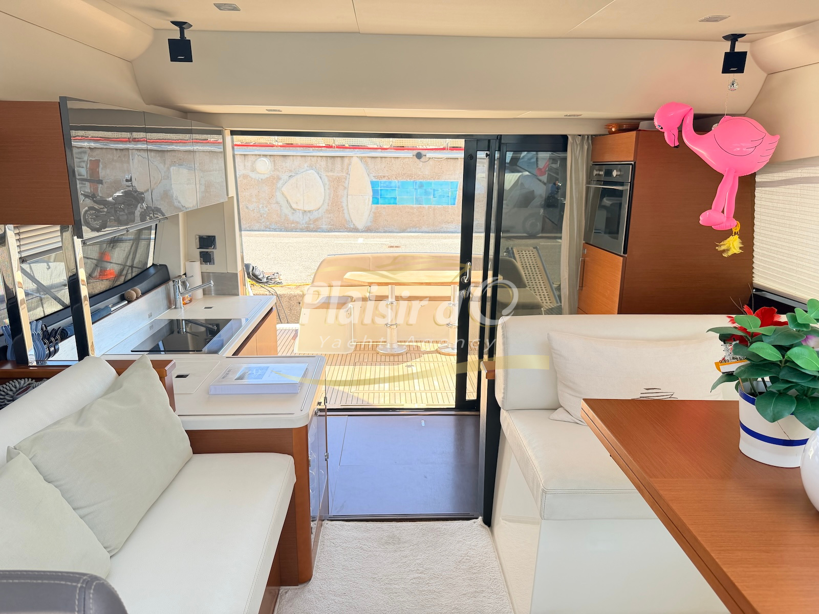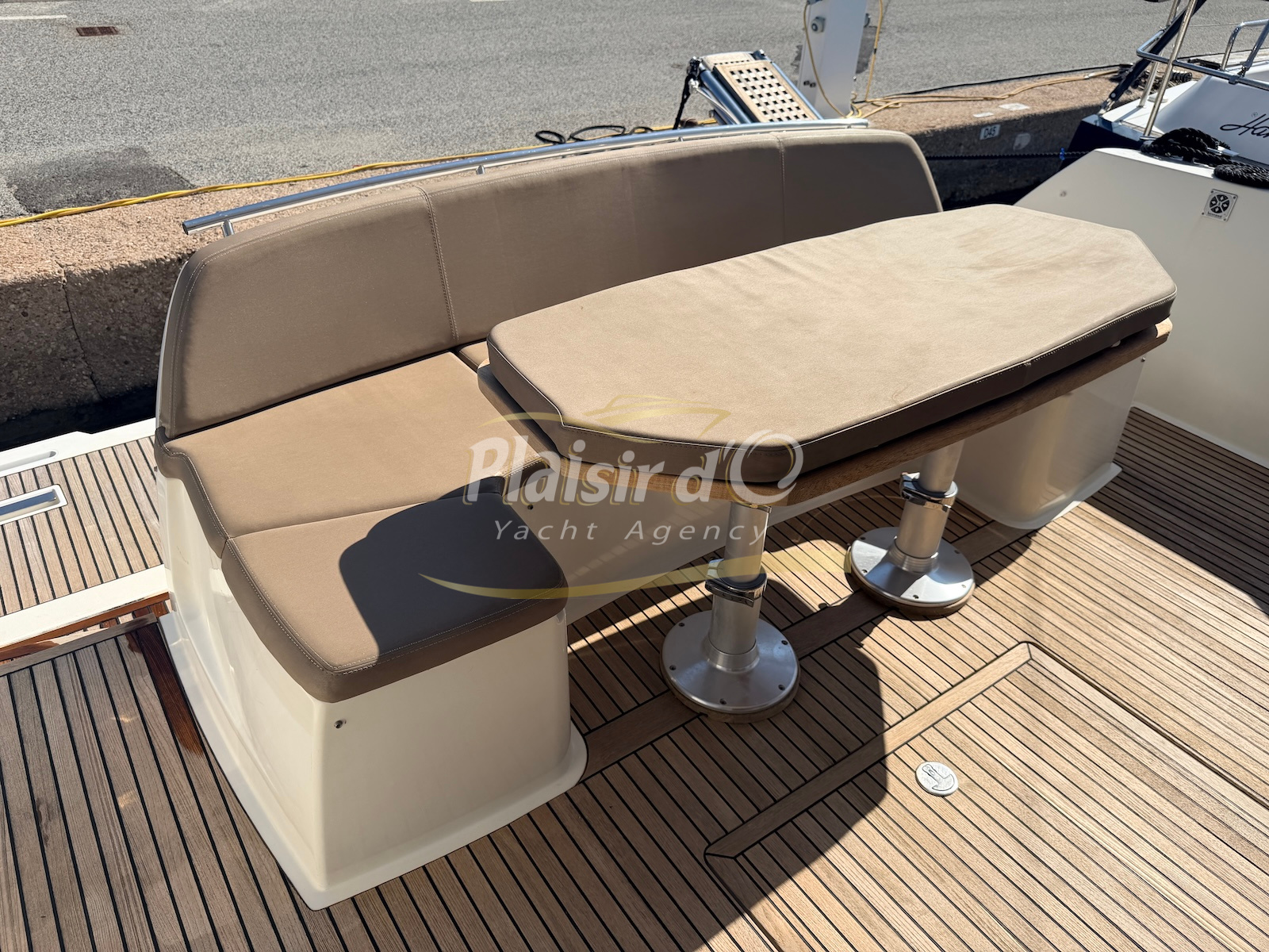 OPTIONS : Passerelle hydraulique, générateur MASE, climatisation réversible, Hard-top électrique, pilote automatique, cockpit et plateforme de bain en teck, lave vaisselle, store électrique, taud de pare brise micro perforé, compteur de chaine, propulseur d’étrave…