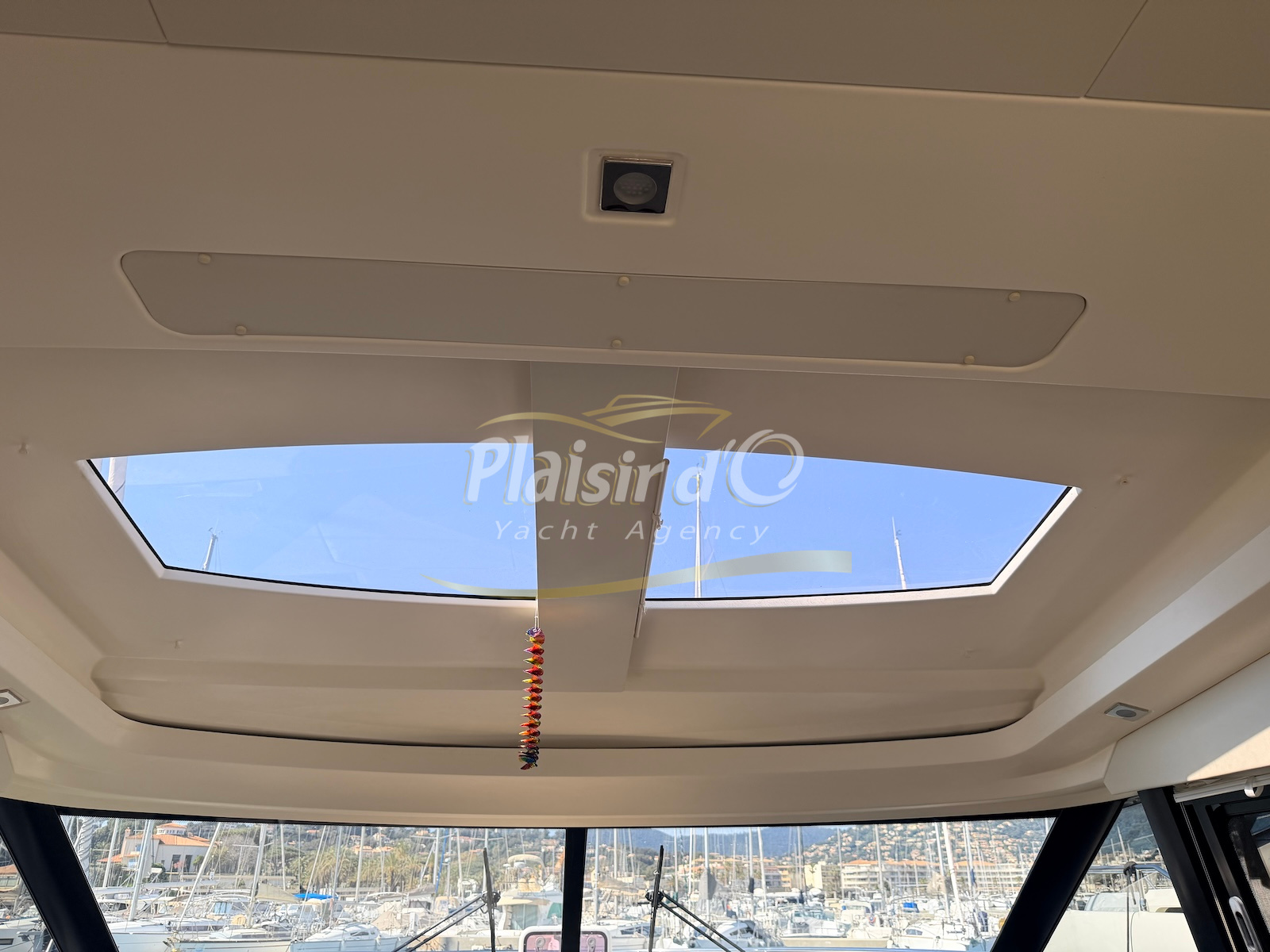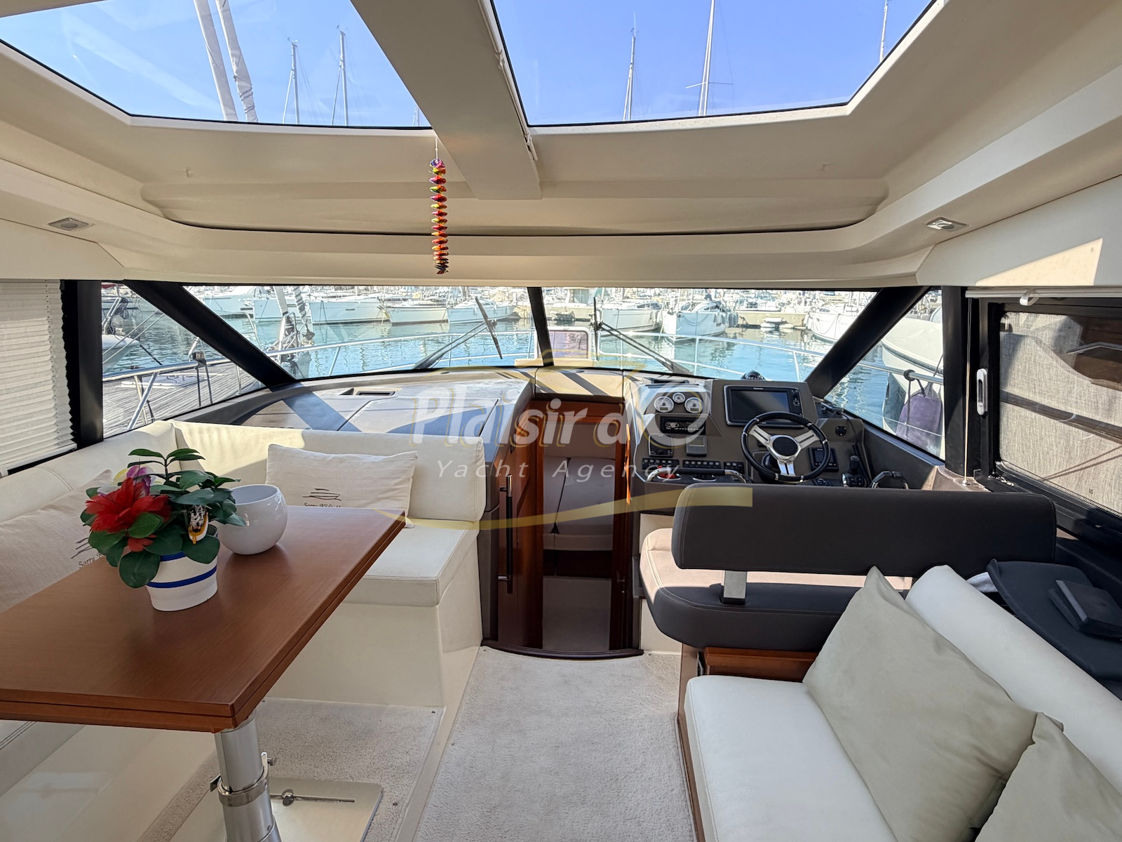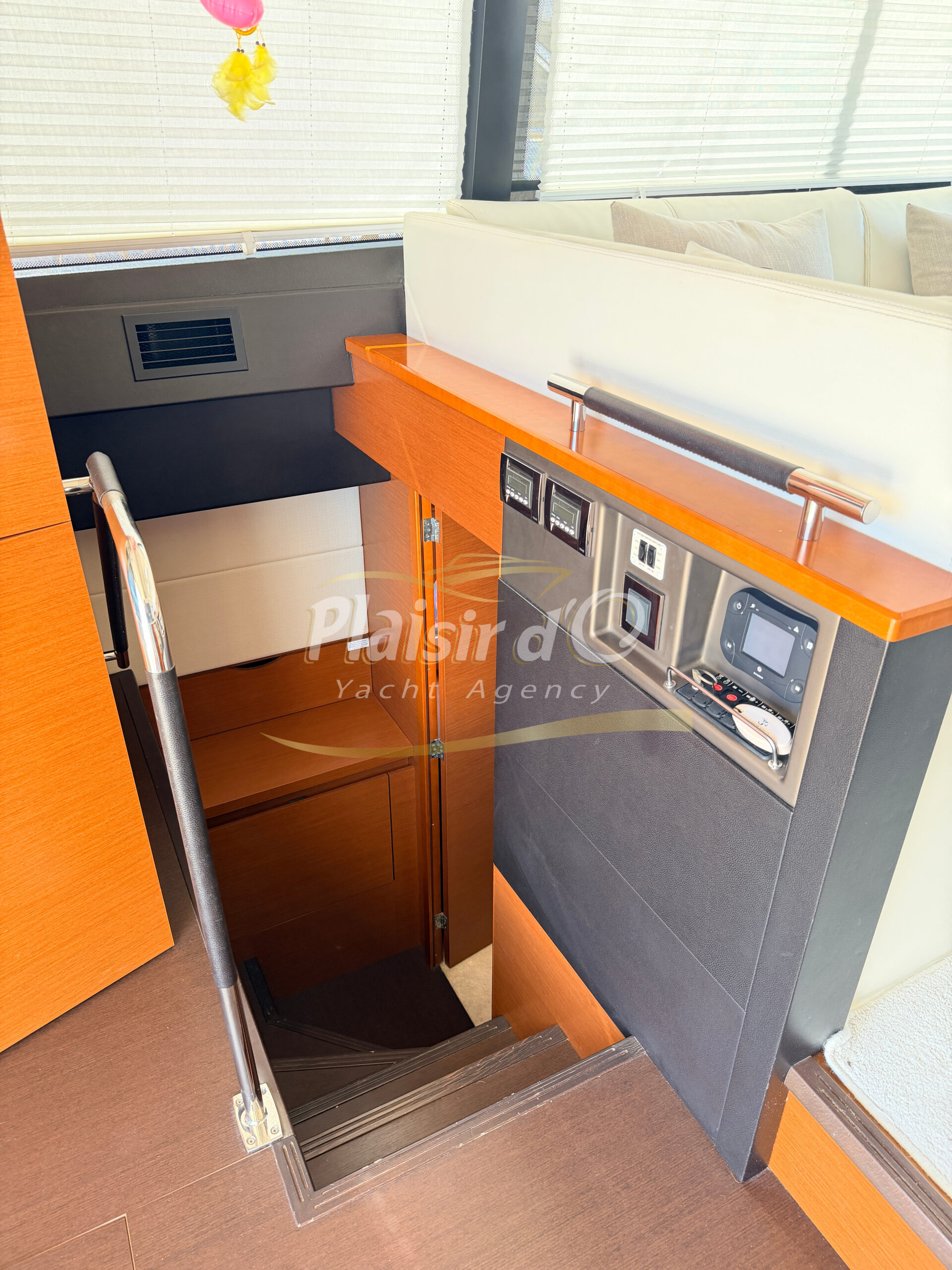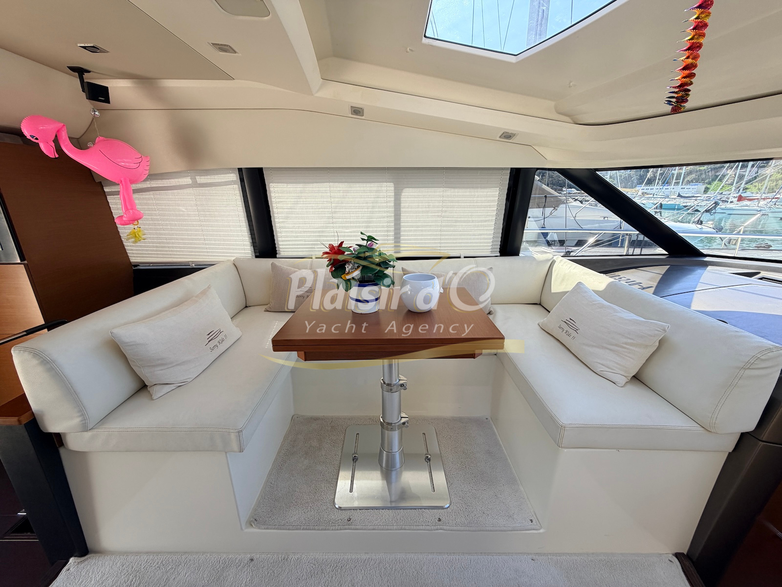 OPTIONS : Passerelle hydraulique, générateur MASE, climatisation réversible, Hard-top électrique, pilote automatique, cockpit et plateforme de bain en teck, lave vaisselle, store électrique, taud de pare brise micro perforé, compteur de chaine, propulseur d’étrave…