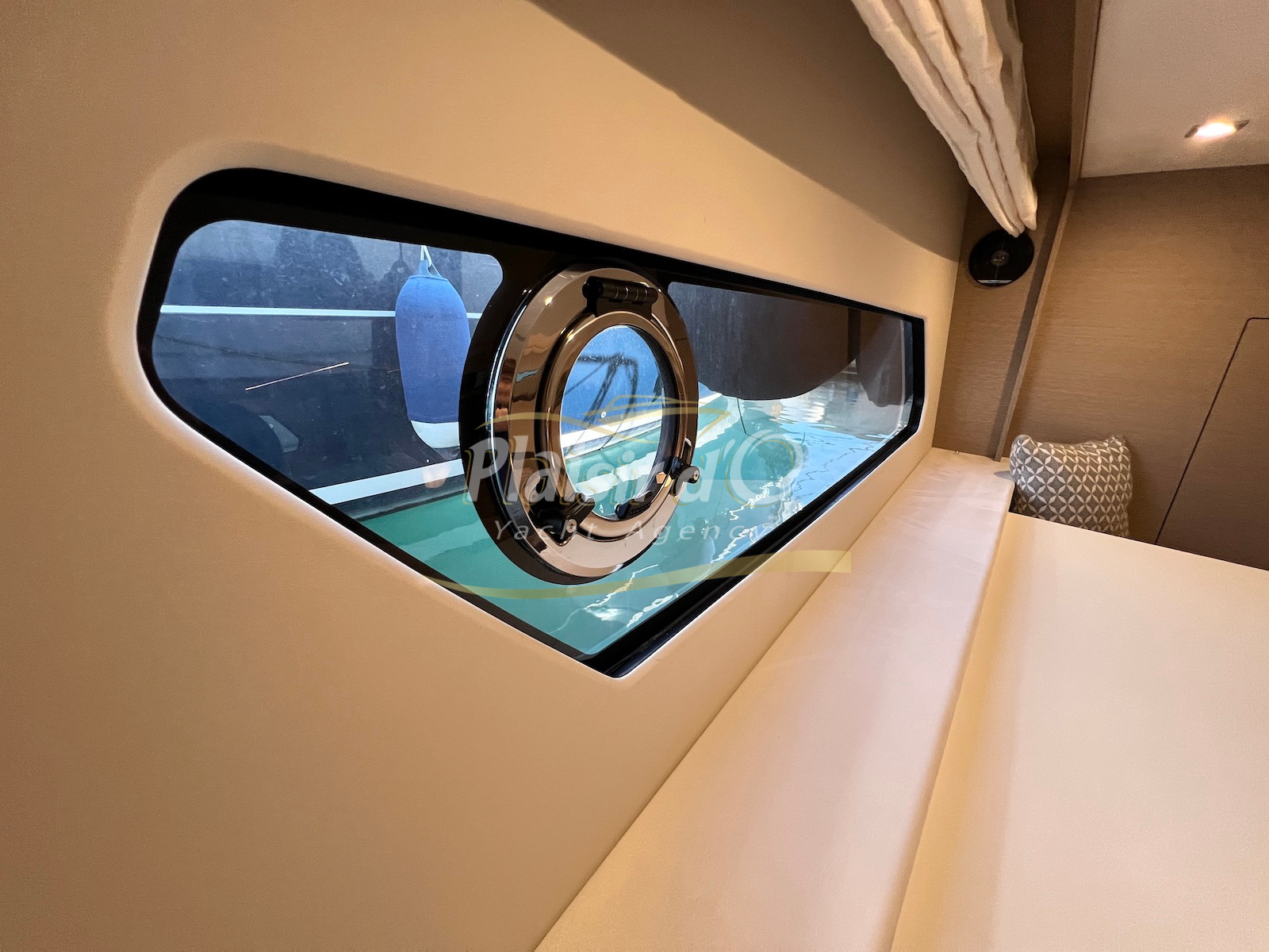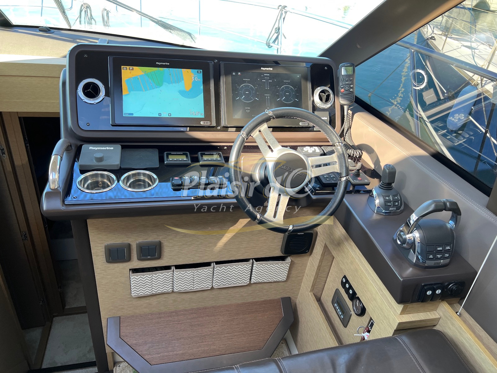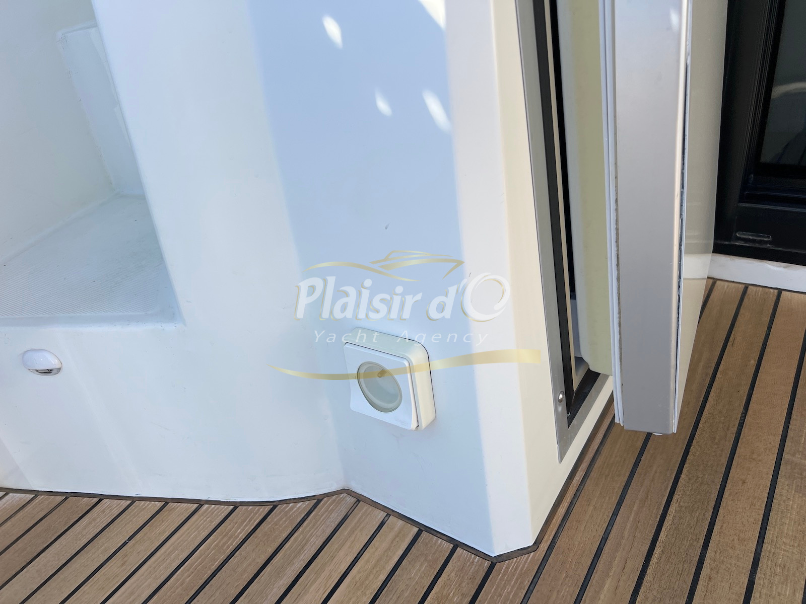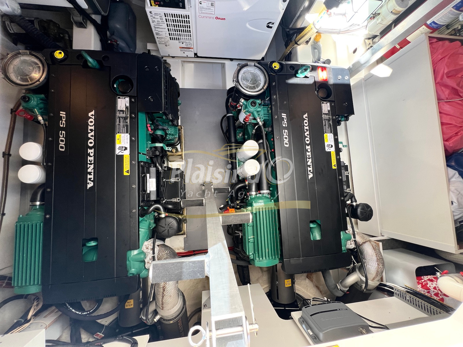 Motorisé par 2 x Volvo IPS 500, totalisant seulement environ 360 heures, il offre une navigation souple, silencieuse et sécurisante, avec joystick de manœuvre et second poste de pilotage au cockpit arrière, idéal pour les accostages.