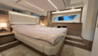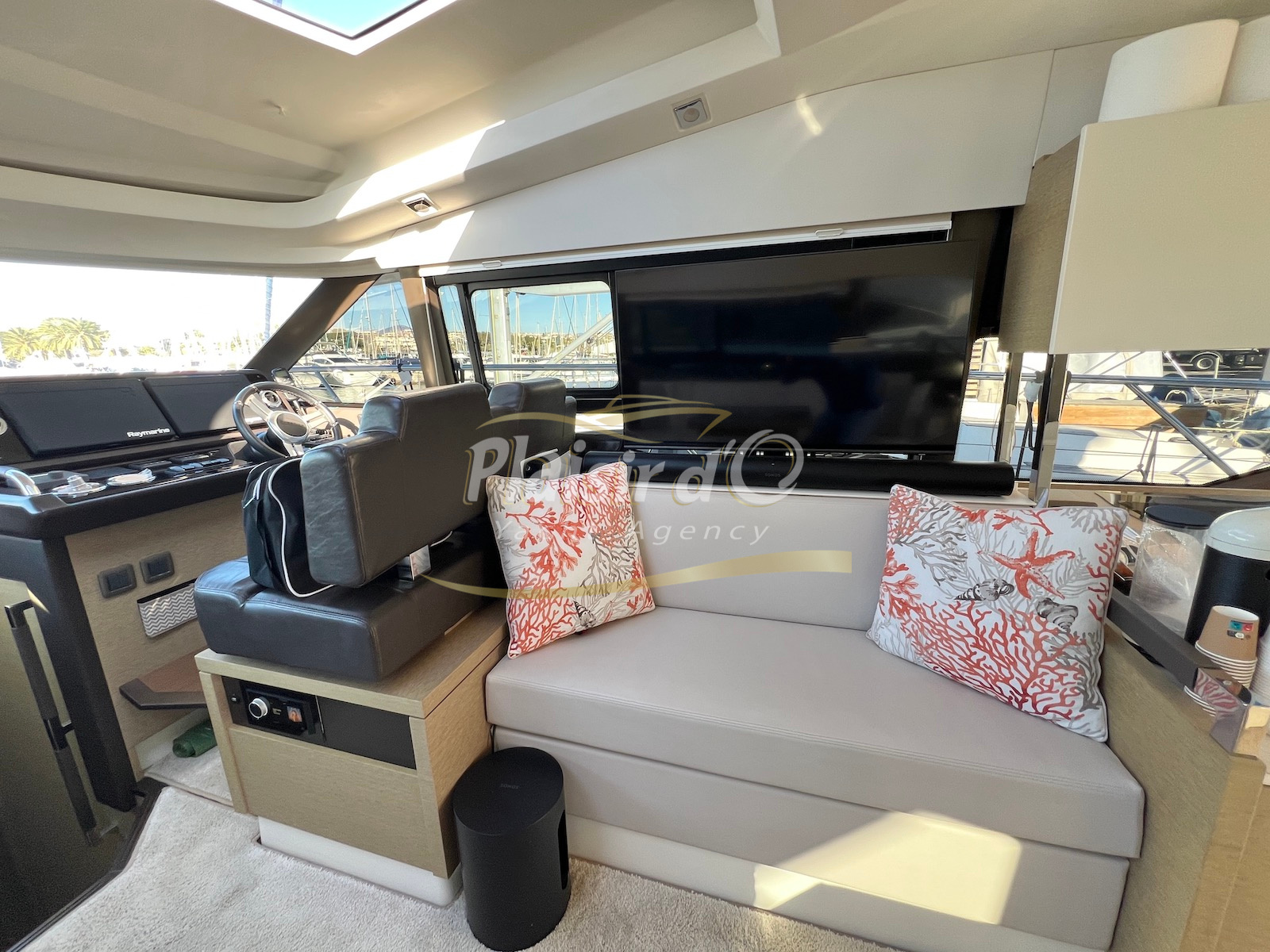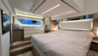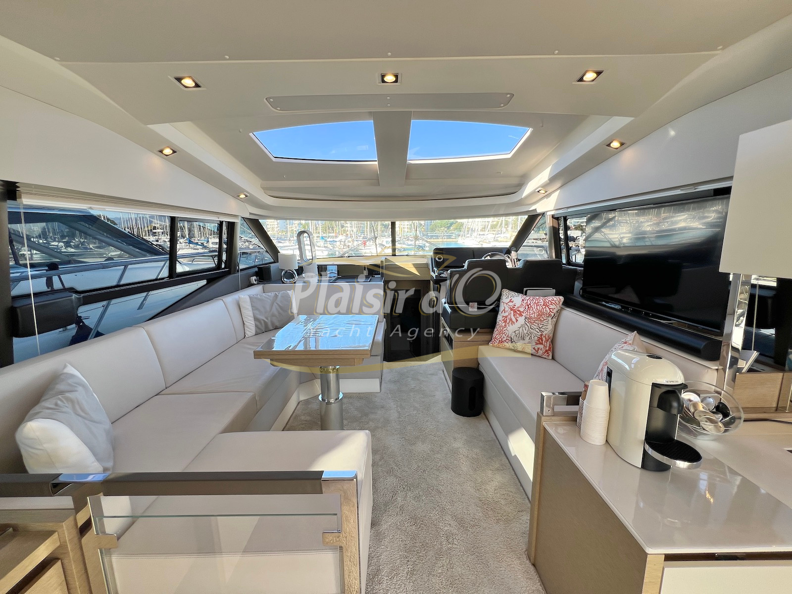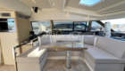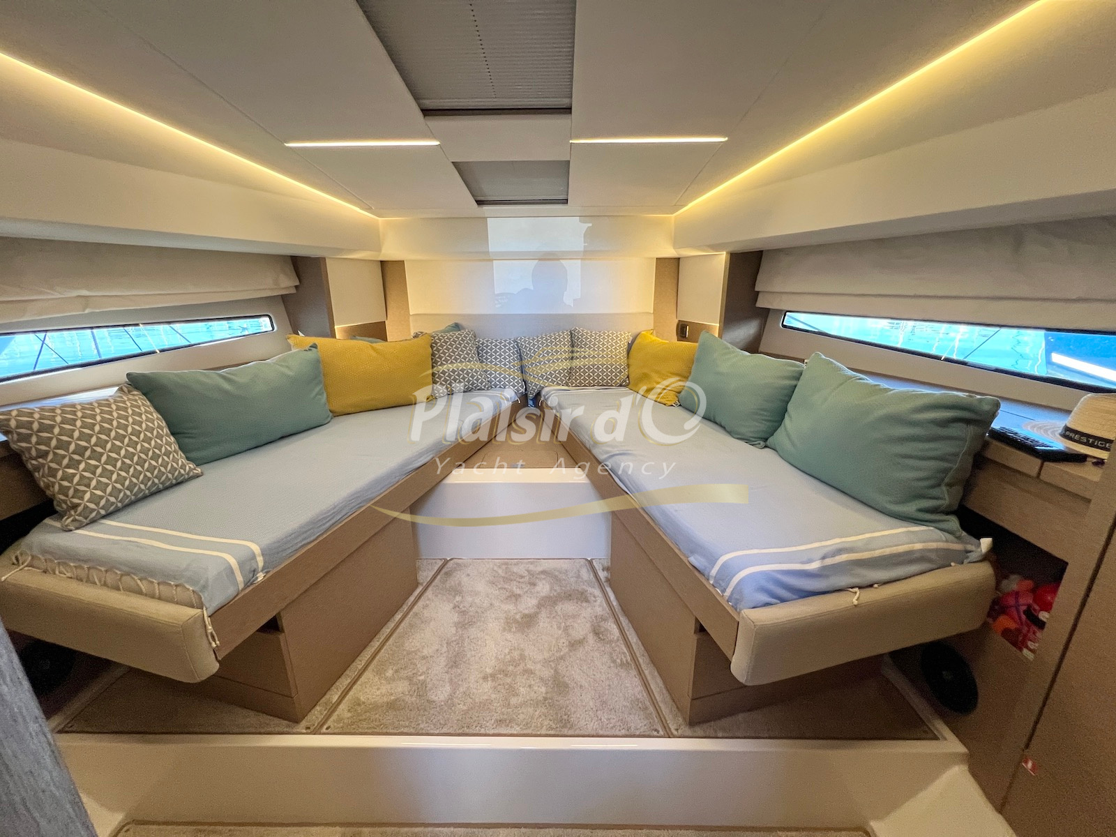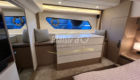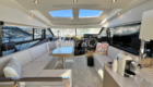 Le Prestige 460 S séduit par son immense toit ouvrant électrique, ses doubles baies latérales et son carré panoramique, ouvert sur le cockpit grâce à une large baie vitrée coulissante. Il dispose de beaux volumes et l’ambiance à bord est moderne, chaleureuse et raffinée.
