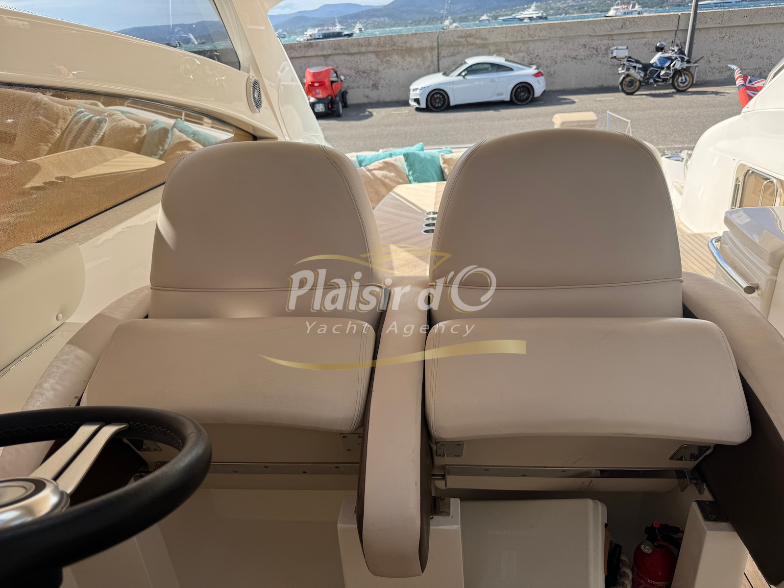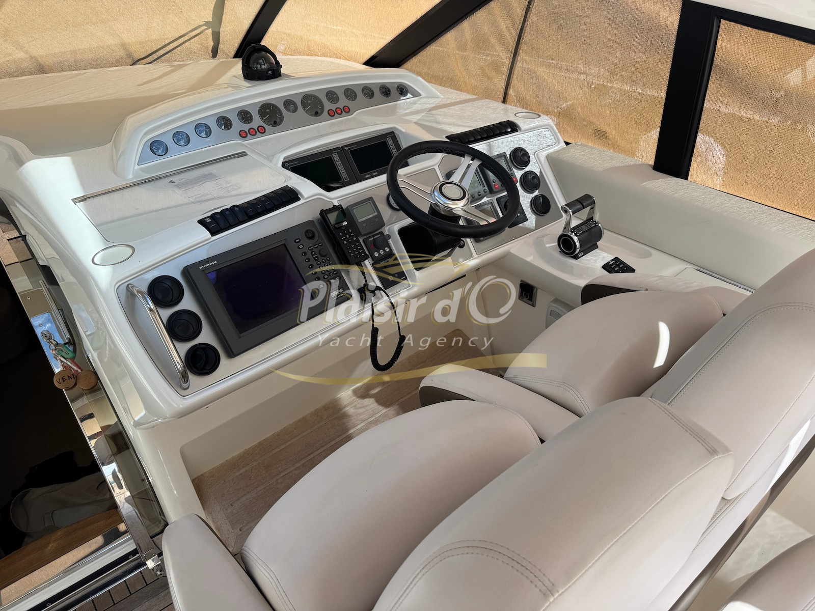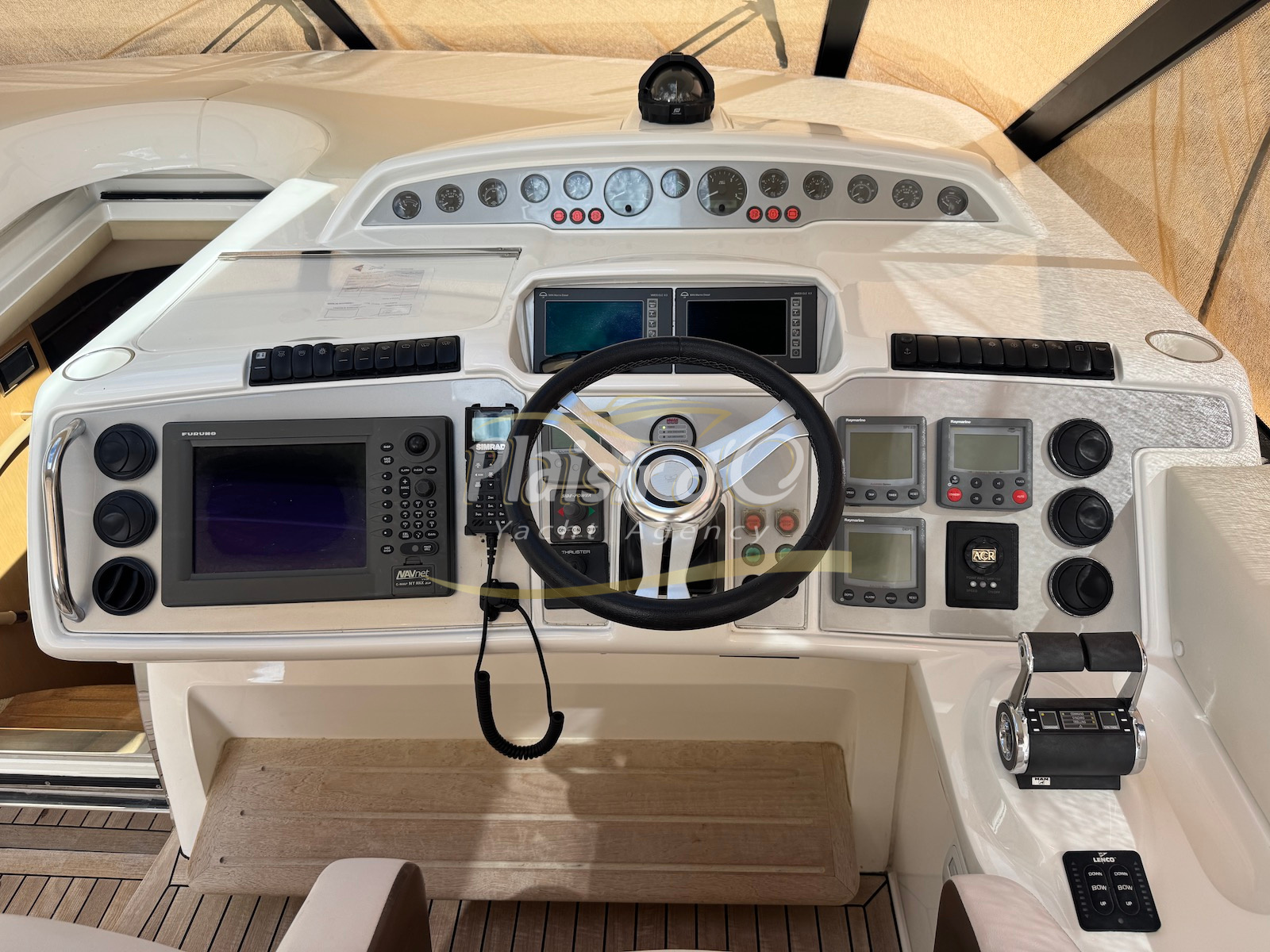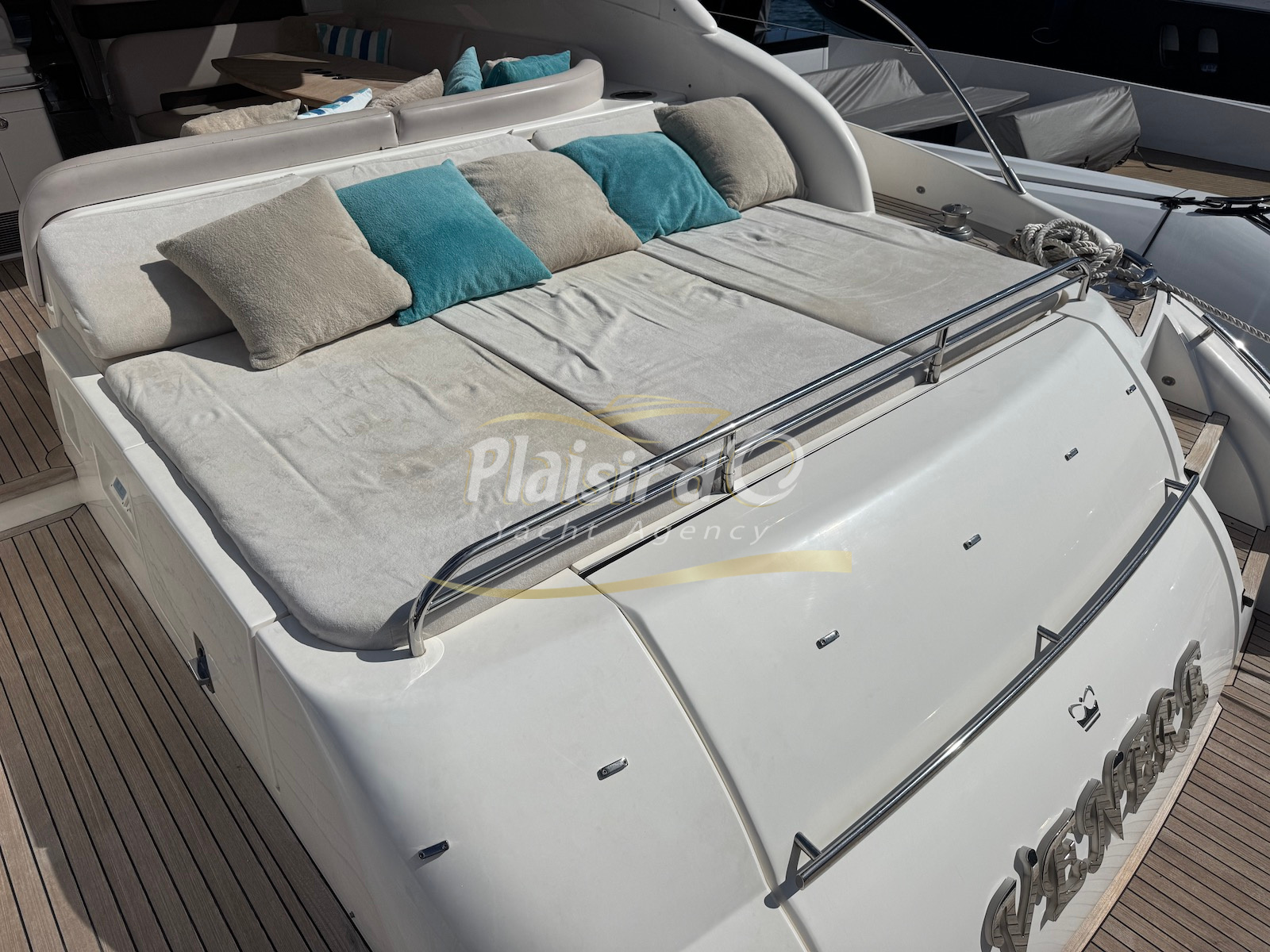 Nombreuses options : motorisation maximale, propulseur d’étrave et de proue, générateur, climatisation réversible, lave-vaisselle, 2 réfrigérateurs, GPS, pilote automatique, VHF, compteur de chaine, flaps, cockpit teck, plateforme de bain teck (neuve), passerelle hydraulique, bains de soleil avant/arrière, plateforme de bain neuve, et annexe rigide avec moteur 9,9cv, garage à annexe avec treuil.